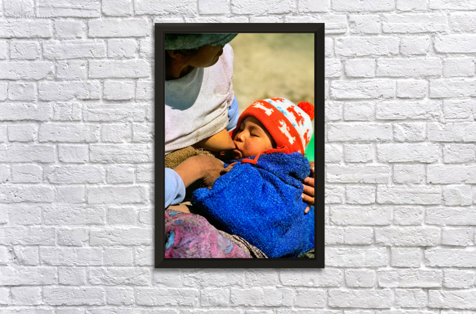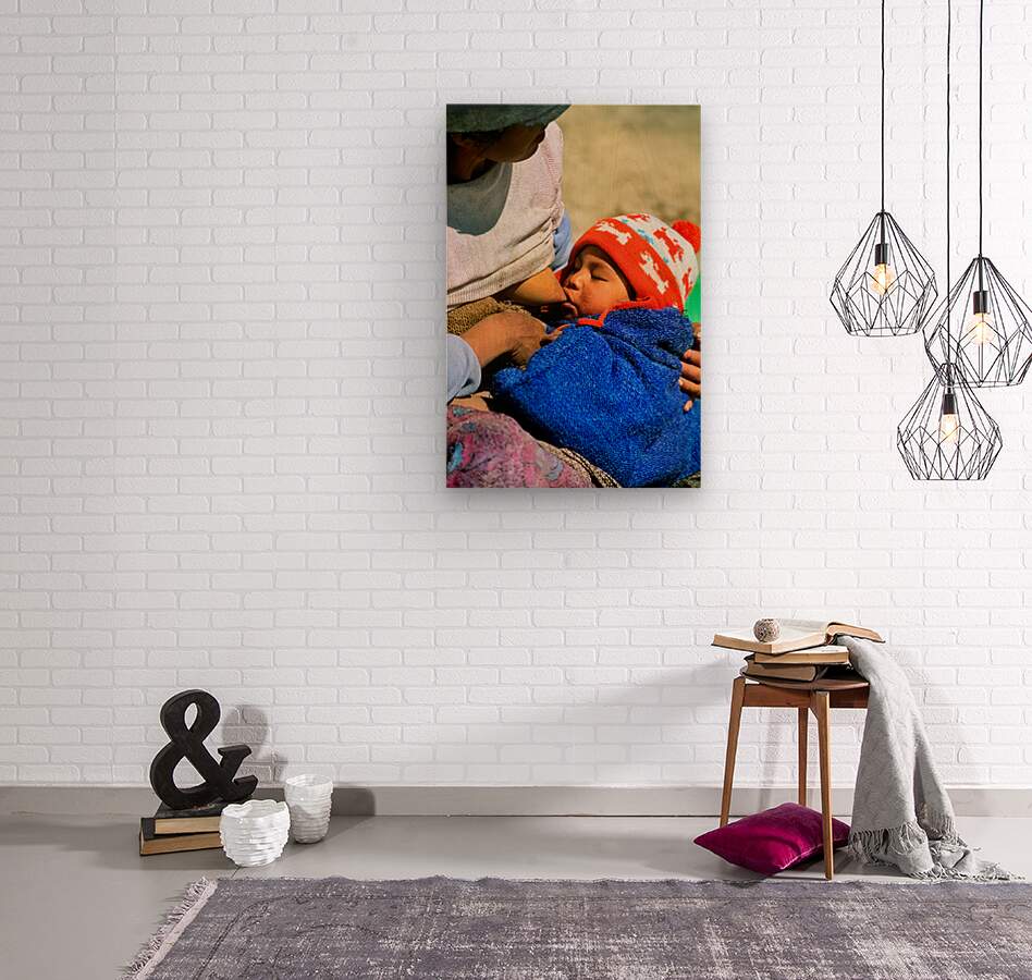 An indigenous mother breastfeeds her young child in the Andes region of Argentina. The child is warmly dressed for the cool weather.