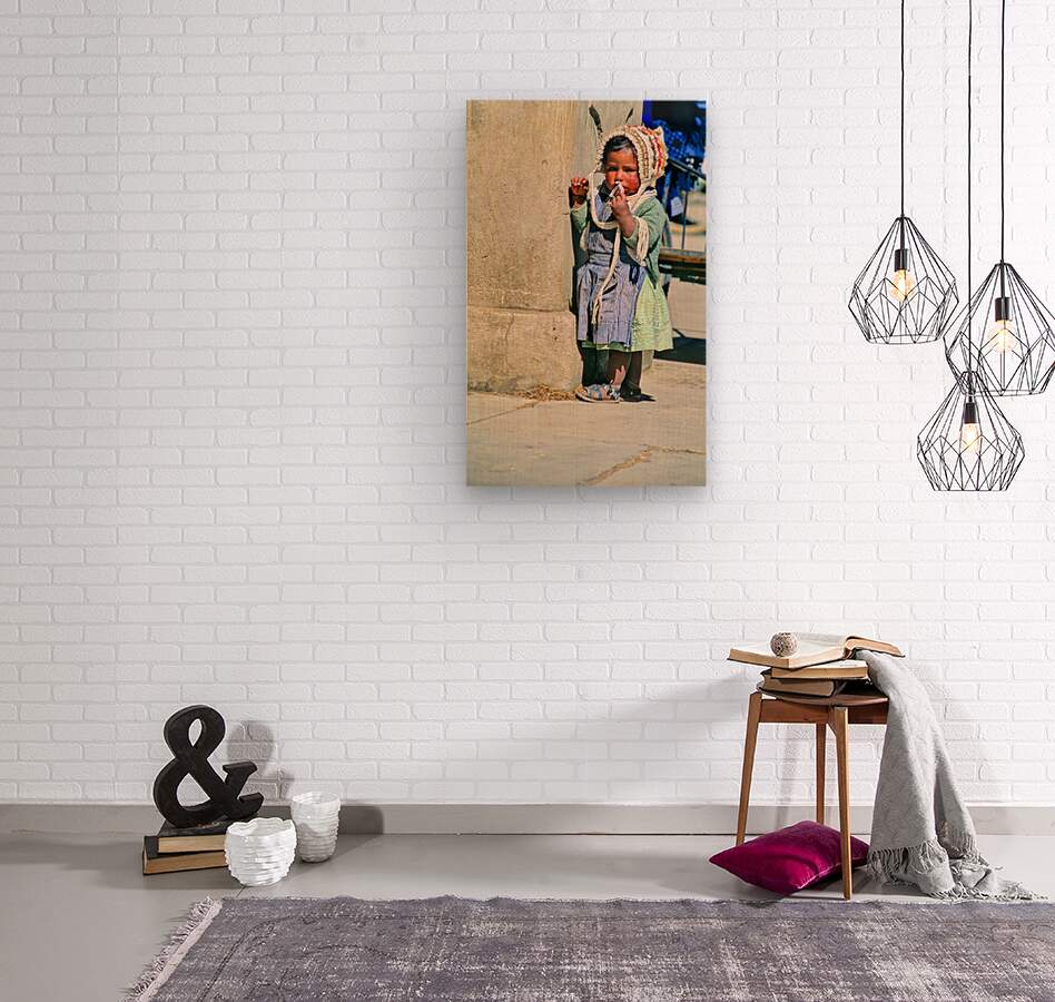 Young child in traditional attire appears to be smoking. Wood print