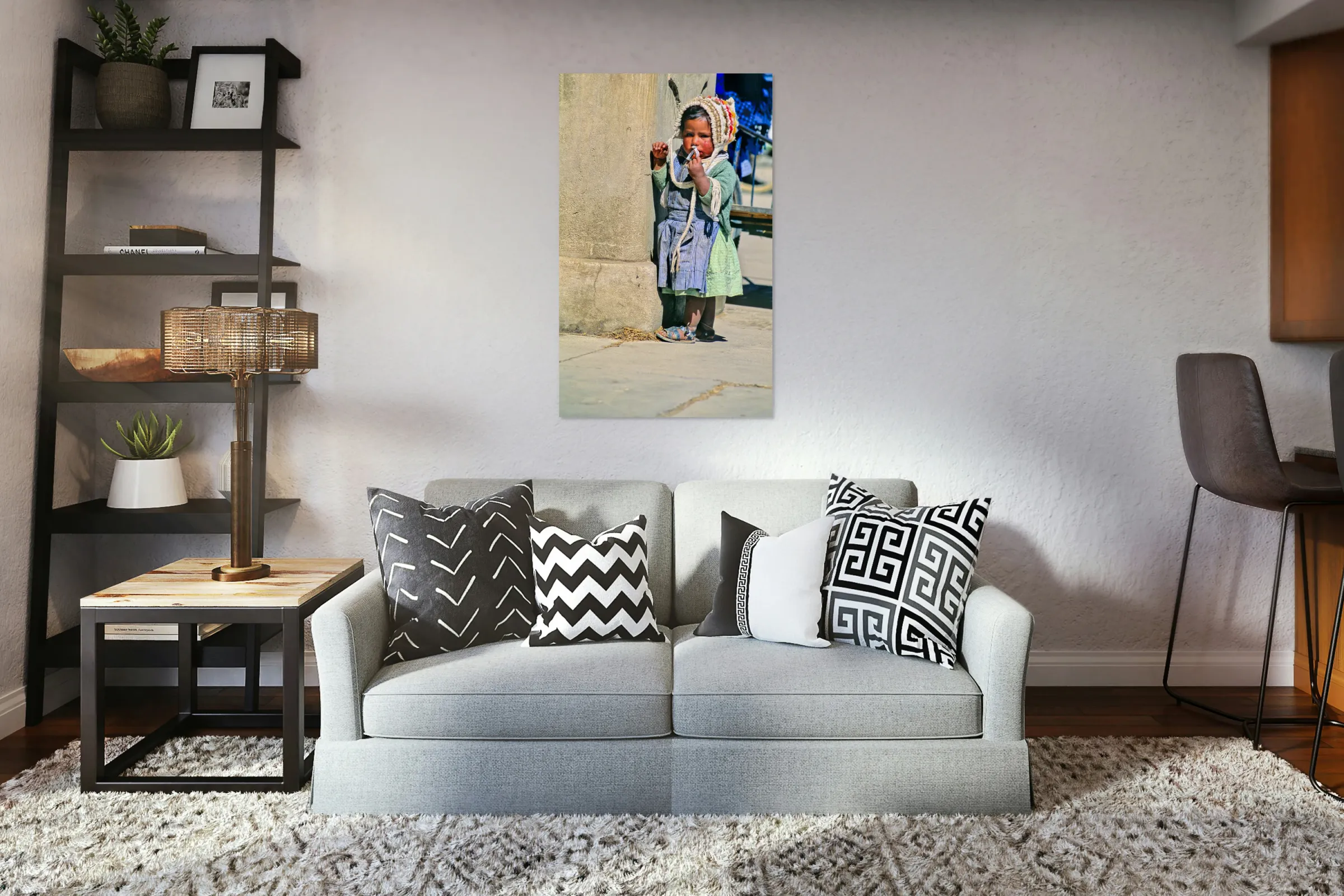 A young child in traditional Andean dress and a knitted hat stands by a pillar holding a small object to their mouth perhaps imitating adults.