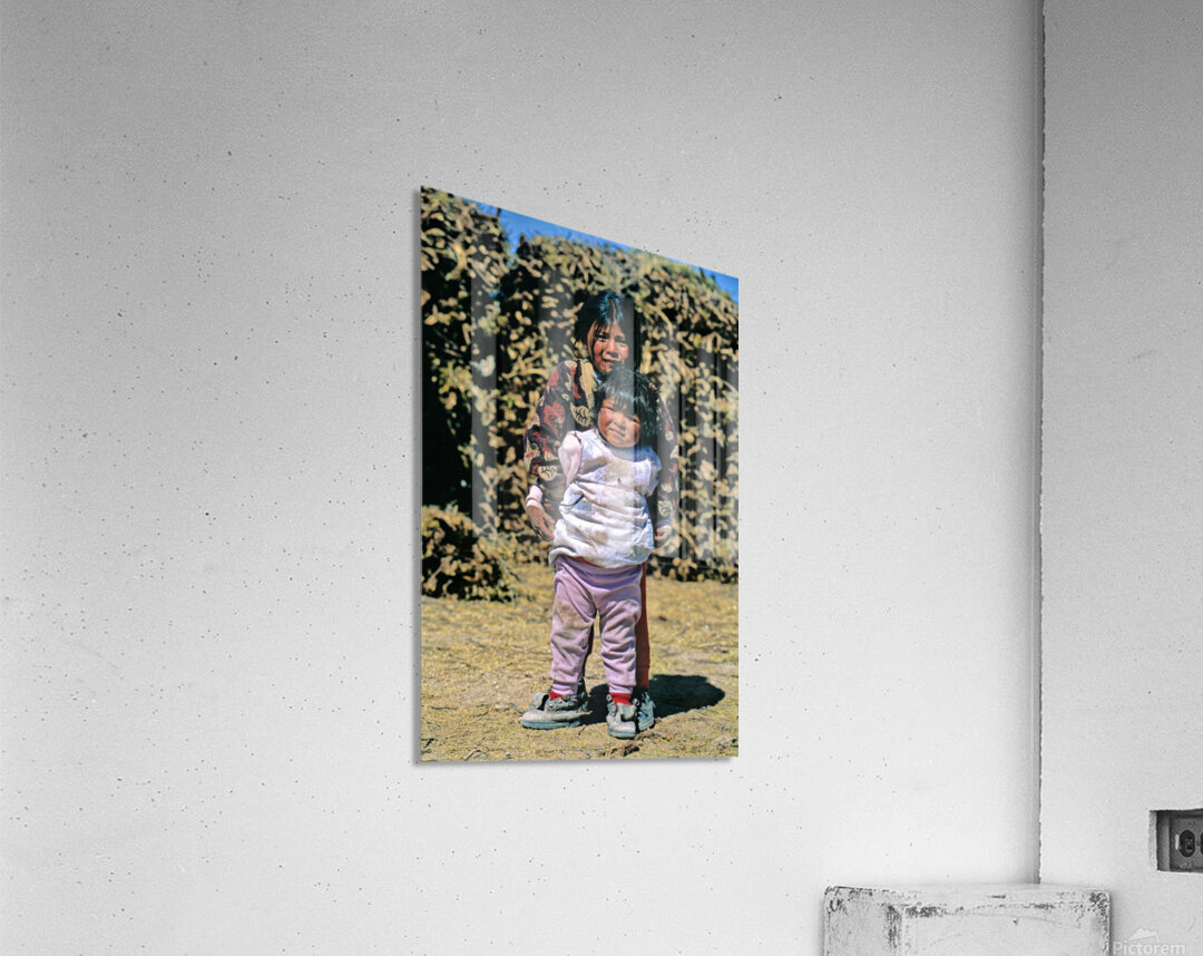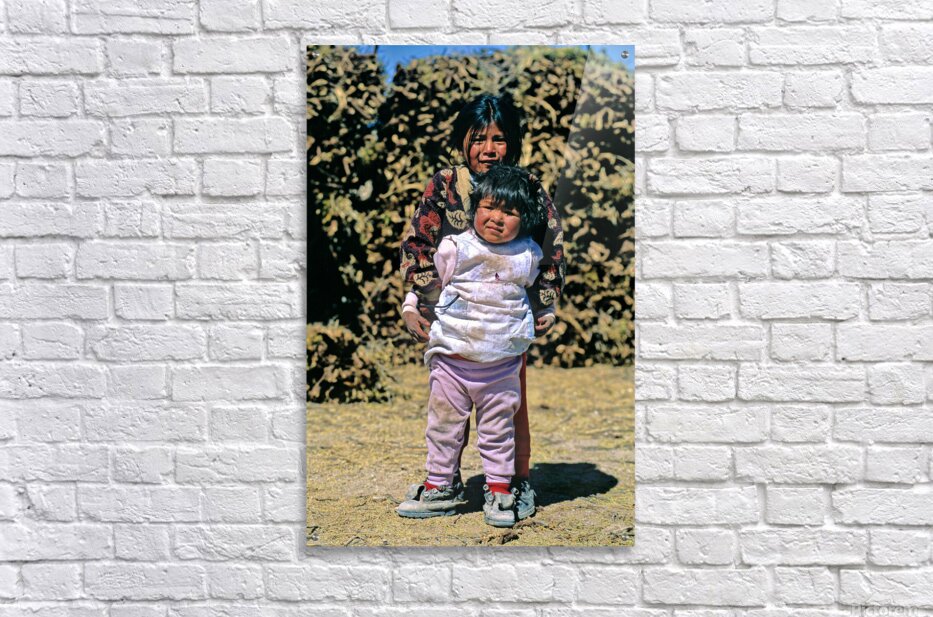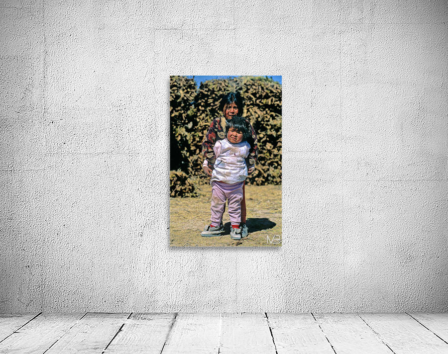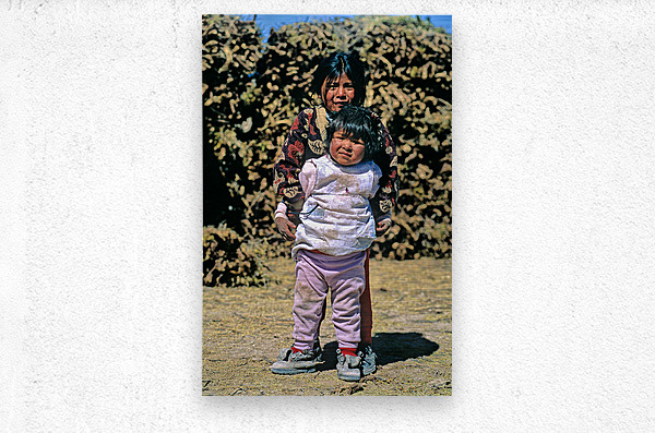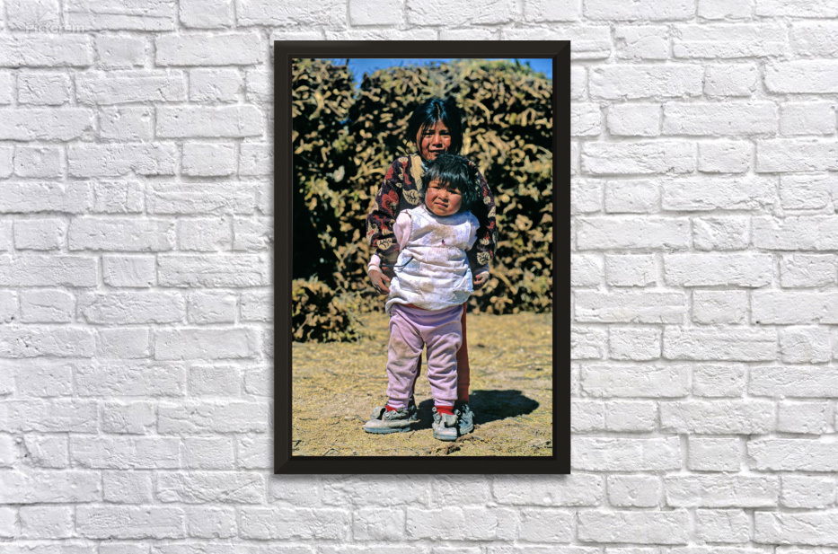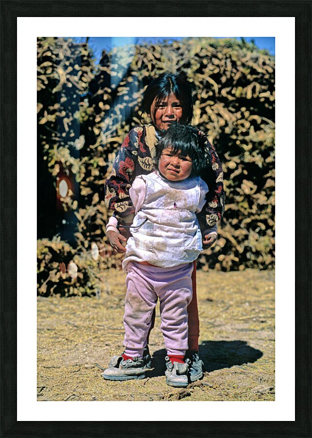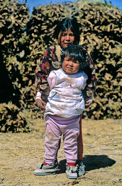 An older indigenous girl supports a younger child outdoors standing before a large pile of dried crops reflecting daily life in a rural community.