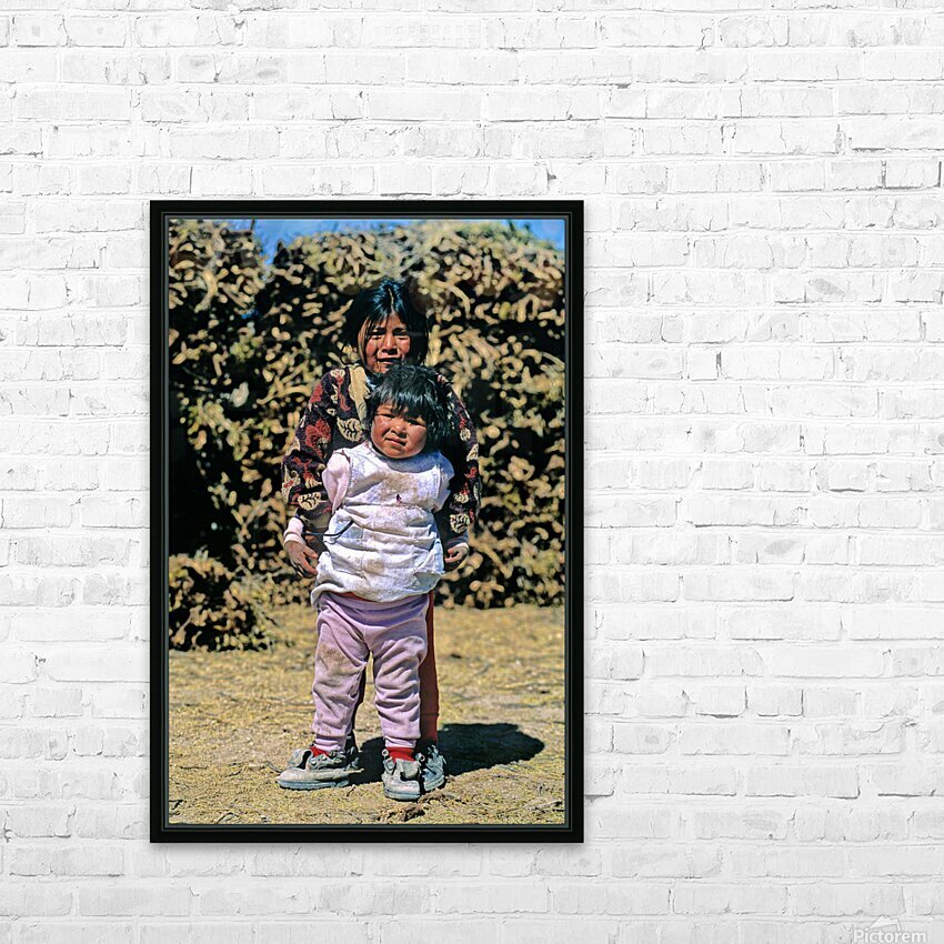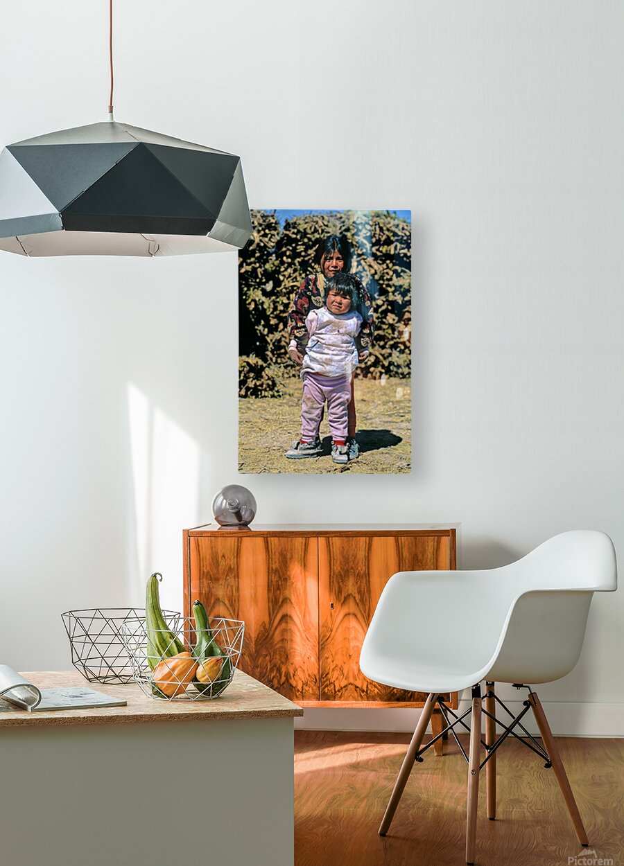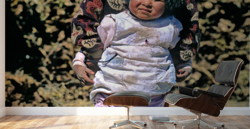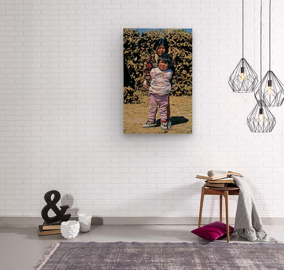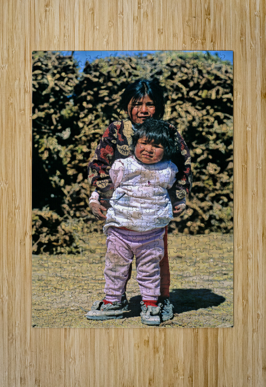 An older indigenous girl supports a younger child outdoors standing before a large pile of dried crops reflecting daily life in a rural community.