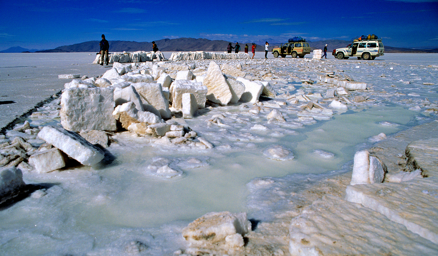 EXPLORERS ON A SALT FLAT WITH SALT BLOCKS AND WATER.