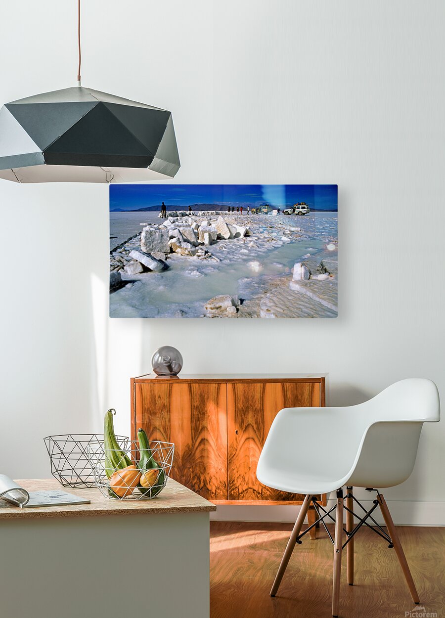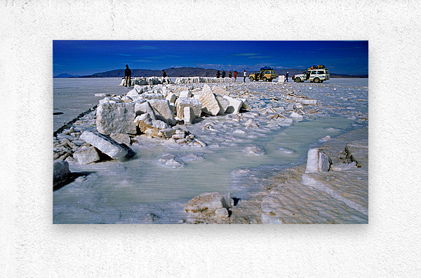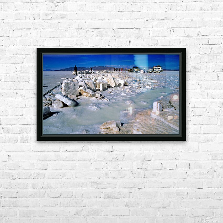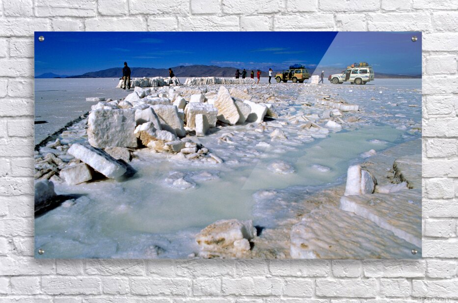 Explorers on a salt flat with salt blocks and water. Picture Frame Printing