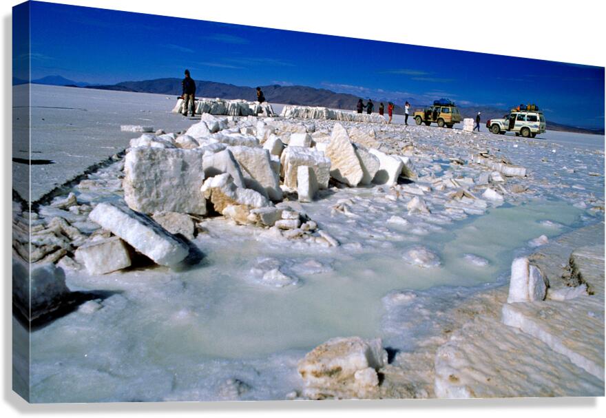 Get this artwork "Explorers on a salt flat with salt blocks and water." in a framed print.