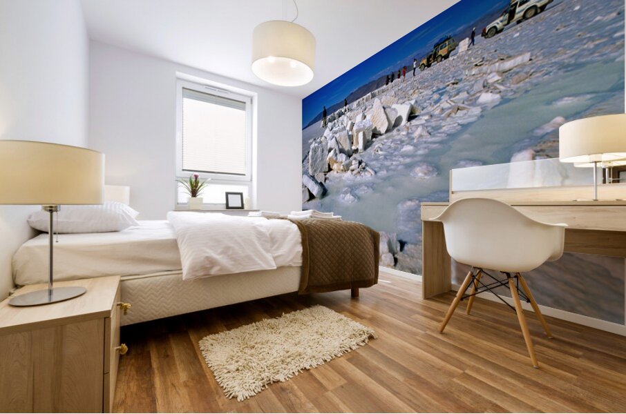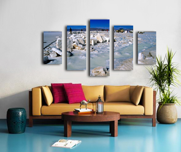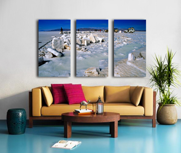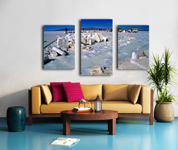 Explorers on a salt flat with salt blocks and water. Frame print