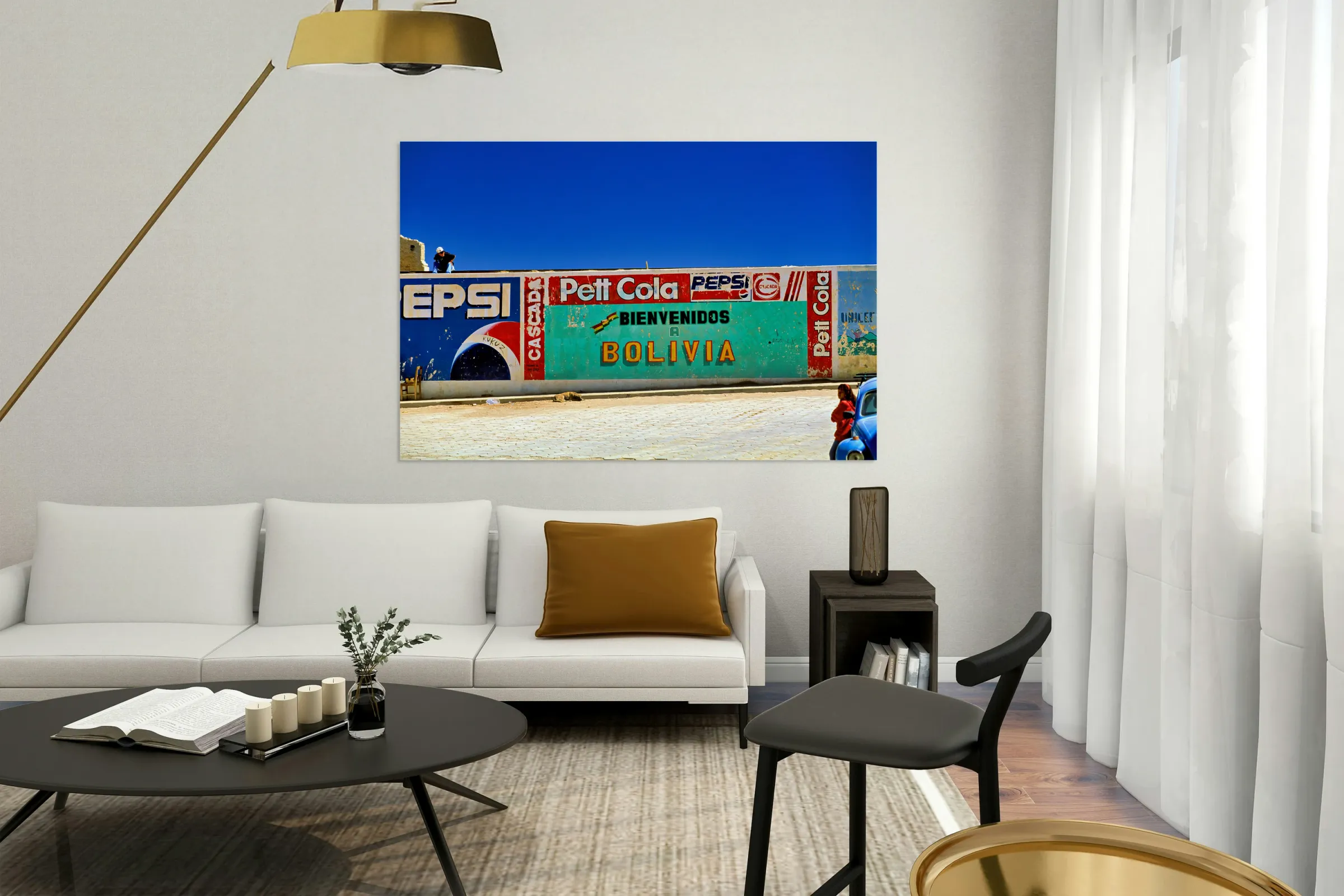 Welcome to Bolivia sign on a wall with old ads. Picture Frame Printing