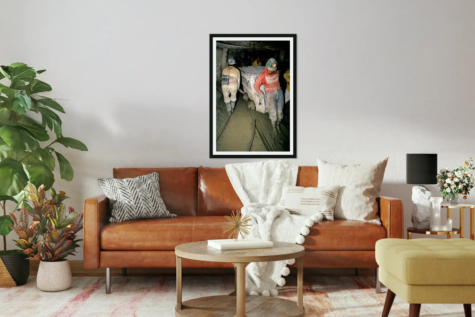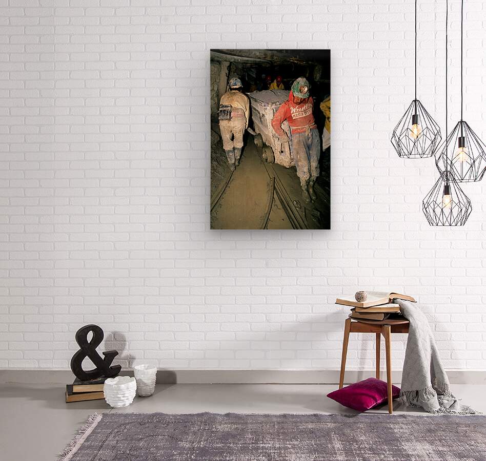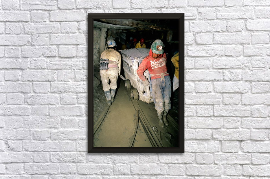 "Miners pushing a loaded cart through a muddy underground mine." in a framed print.