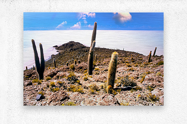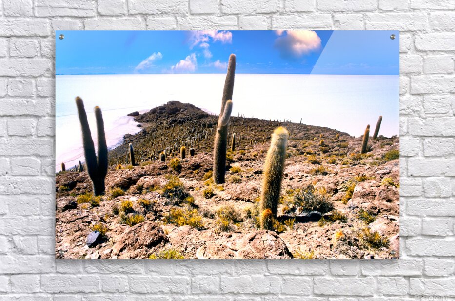 ABOUT THIS ARTWORK: CACTUS ISLAND IN A VAST WHITE SALT FLAT UNDER BLUE SKY.