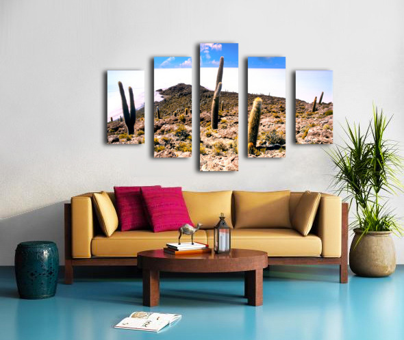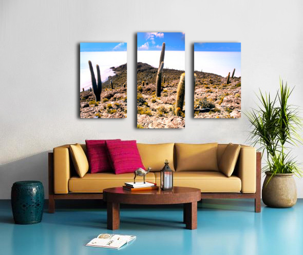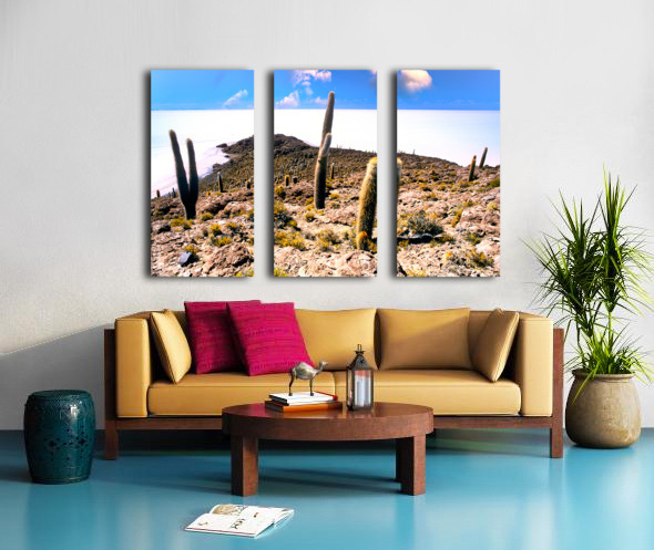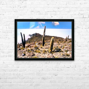 Cactus island in a vast white salt flat under blue sky. Frame print