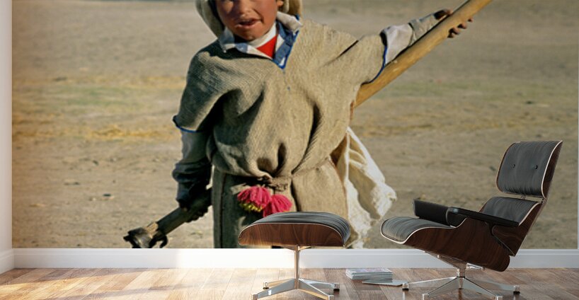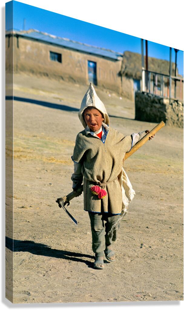 A young Andean boy in traditional clothing walks on a dusty path carrying a stick and a tool likely for work in his rural village.