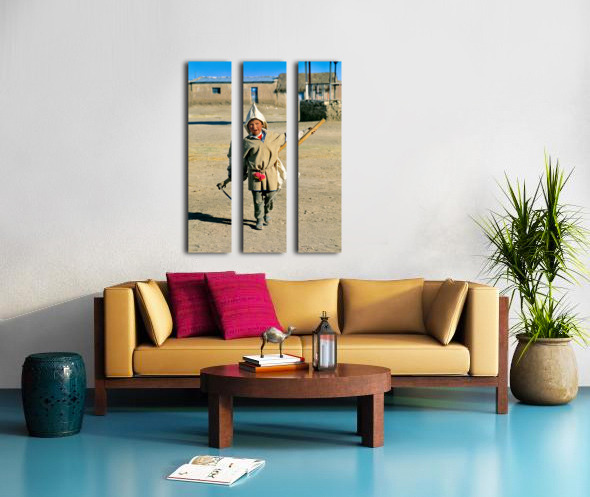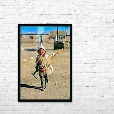 Indigenous boy with tools walks through a dusty village. Frame print
