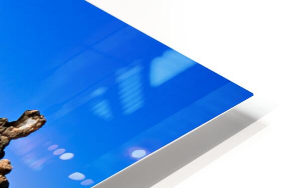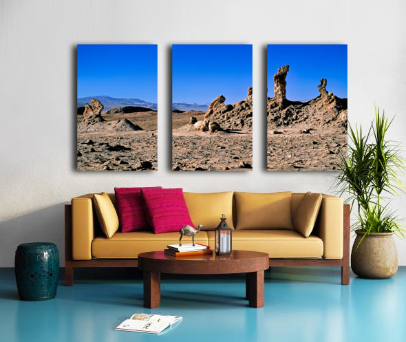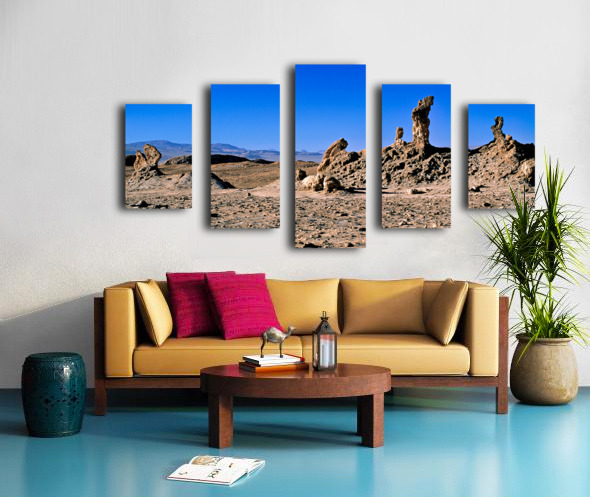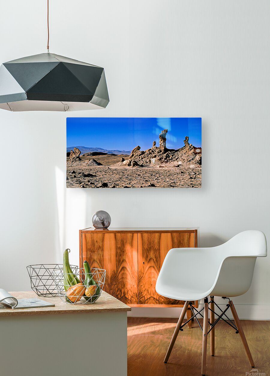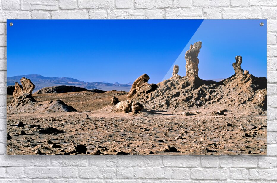 Arid desert with unusual rock pillars against a blue sky. Wood print