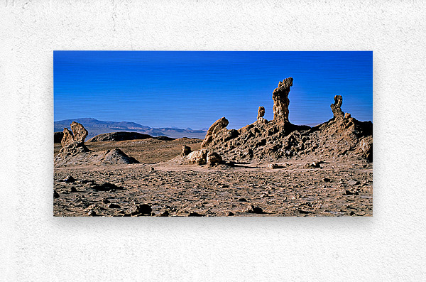 Arid desert with unusual rock pillars against a blue sky.  Wood print