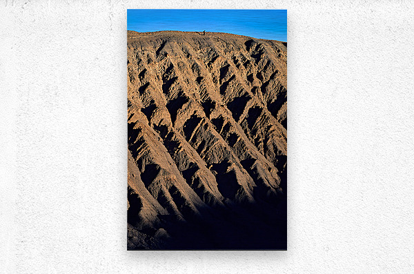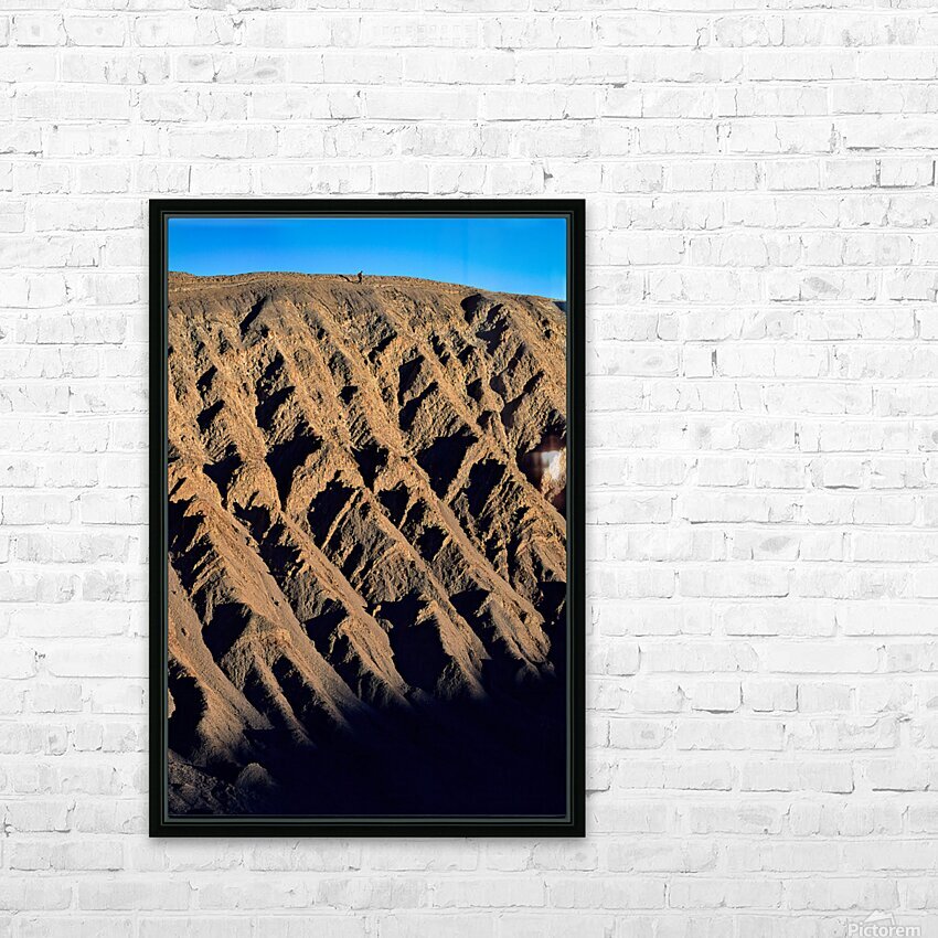 Hiker traverses a dramatic shadowed desert landscape. Picture Frame Printing