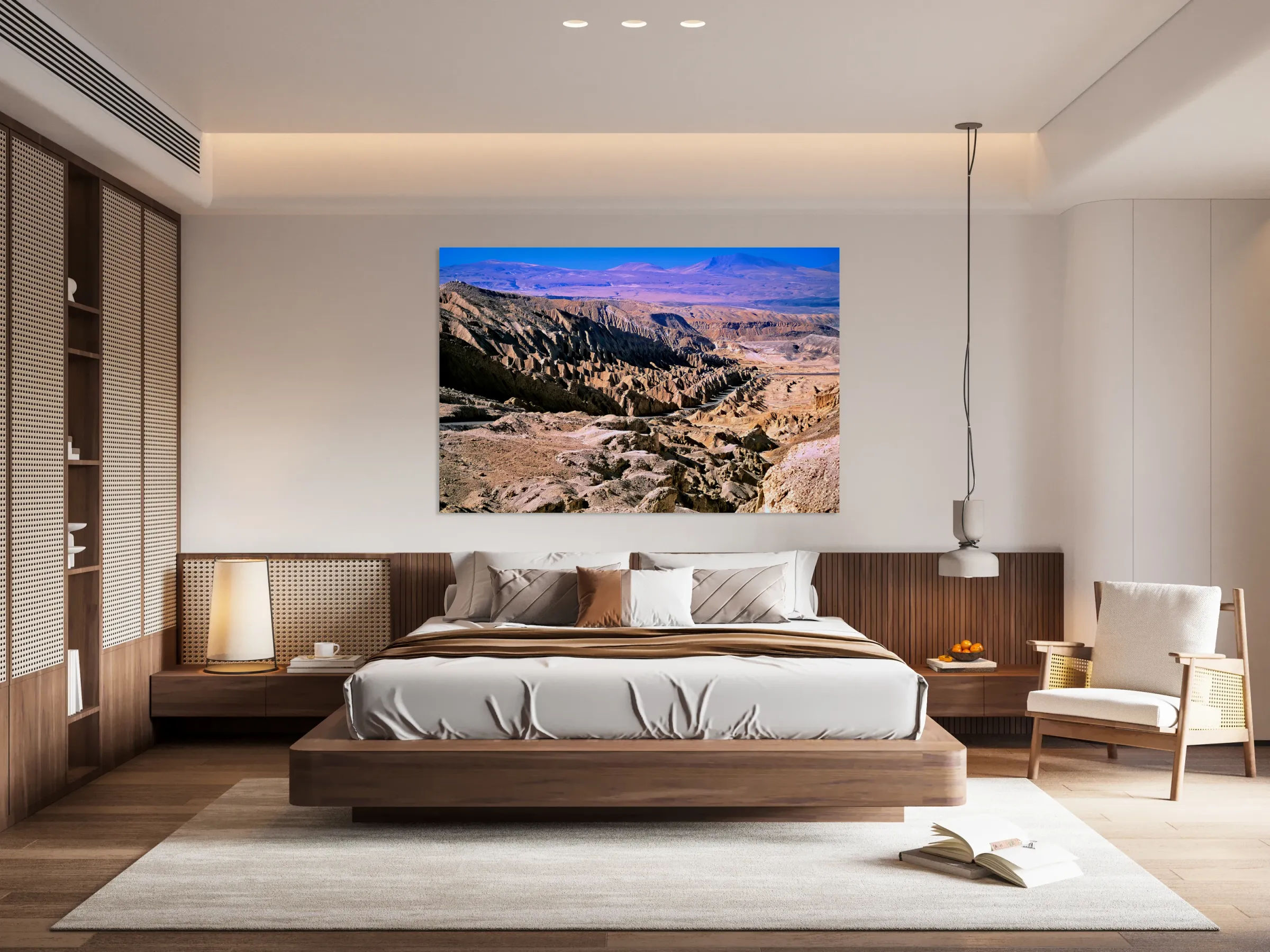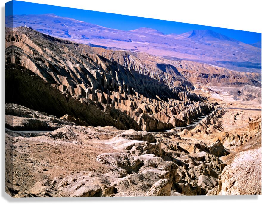 ABOUT THIS ARTWORK: ERODED DESERT LANDSCAPE WITH A ROAD WINDING THROUGH MOUNTAINS.