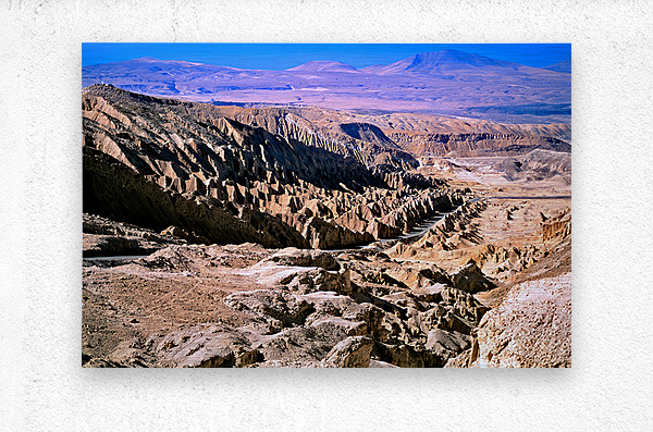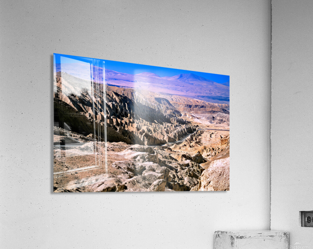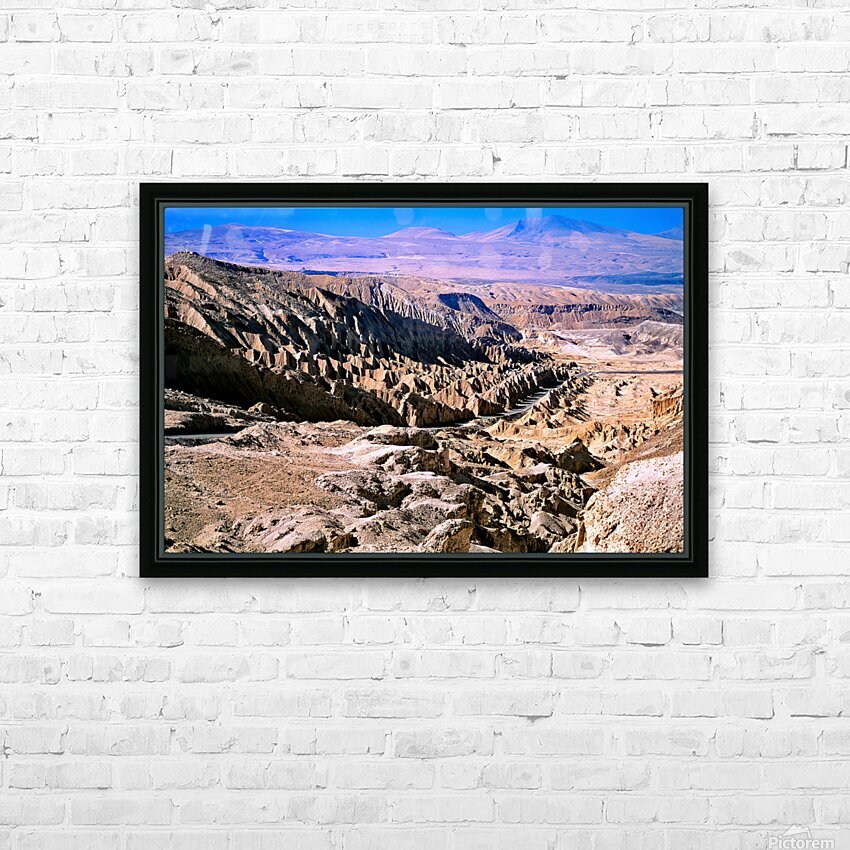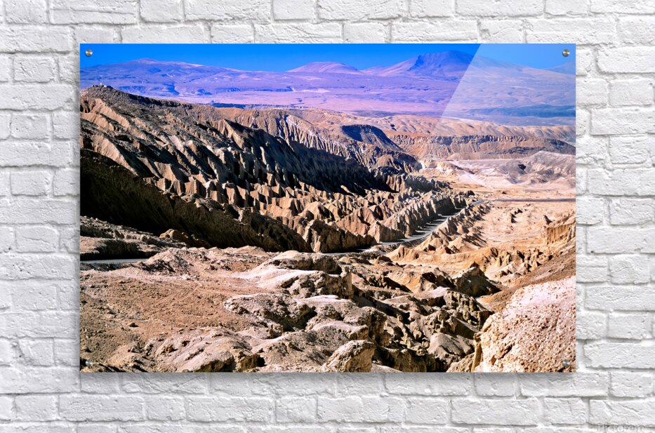 Eroded desert landscape with a road winding through mountains. Picture Frame Printing