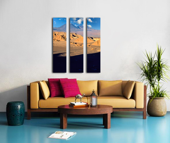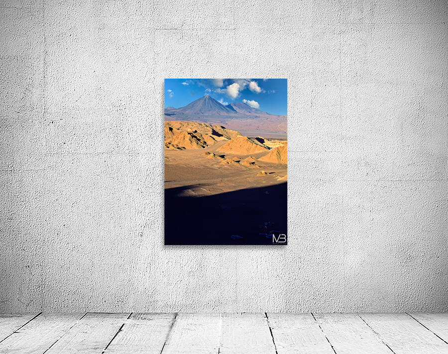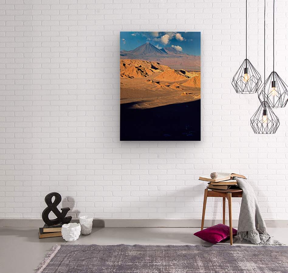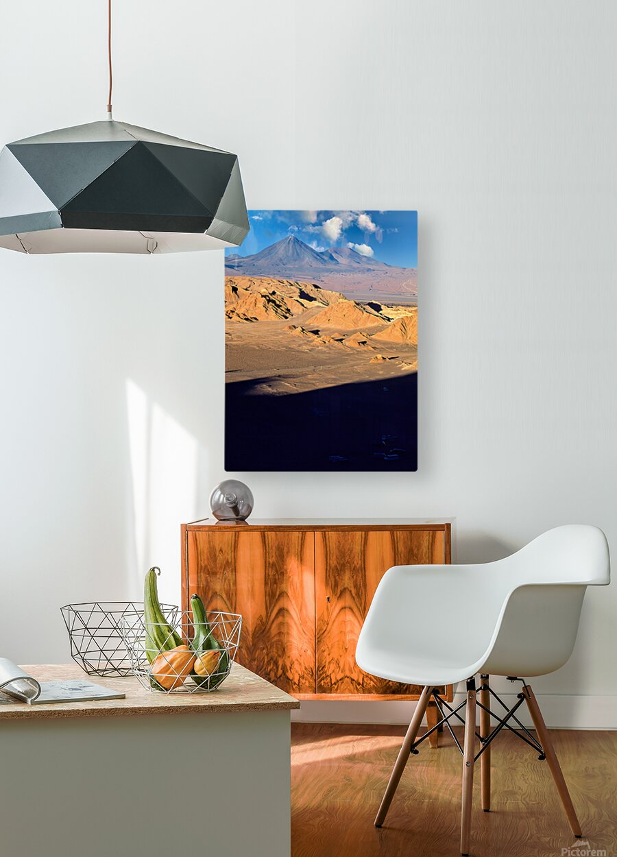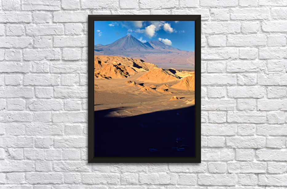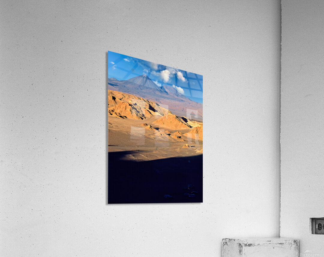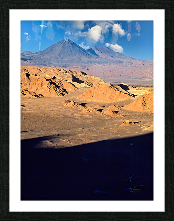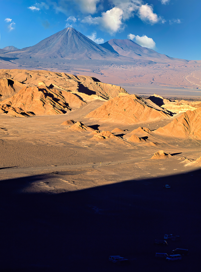 Dramatic desert landscape in Atacama Chile with rugged hills and towering volcanoes under a blue sky. Tourists explore the unique geological formation