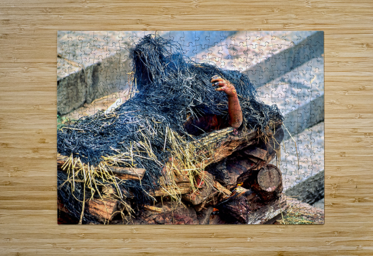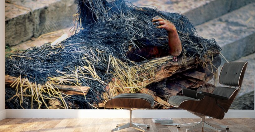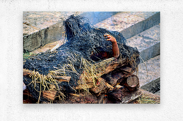 A person is covered with hay during a cremation ceremony at Pashupatinath in Kathmandu. This site is known for Hindu rituals.