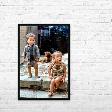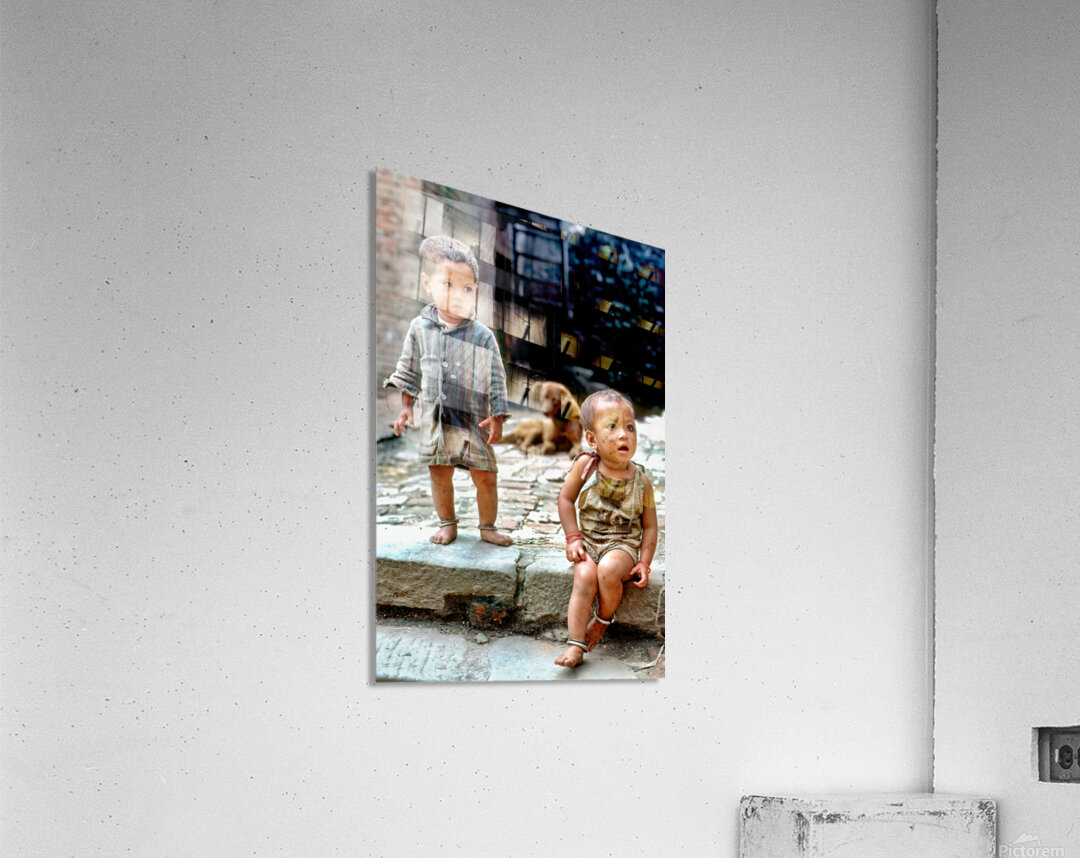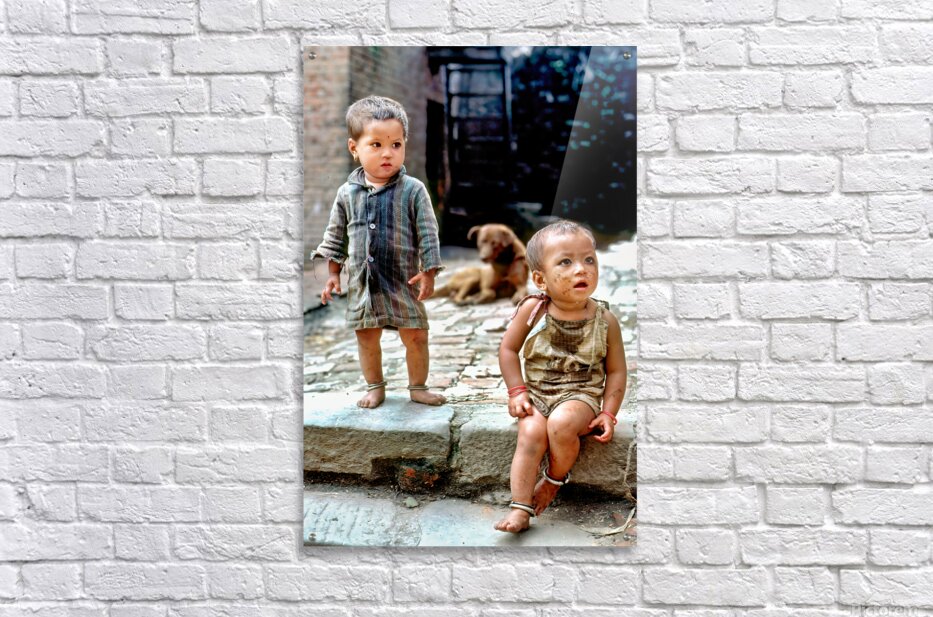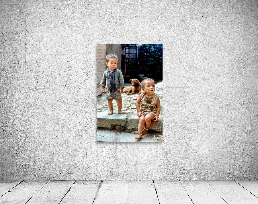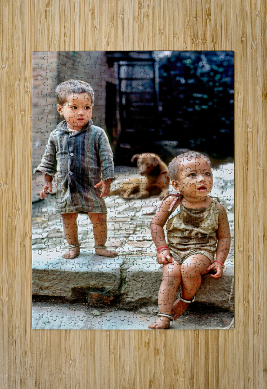 Two children stand on a stone path in Kathmandu looking around. A dog sits nearby. They appear to be enjoying their time outdoors.