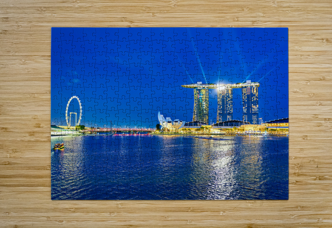 People gather at Marina Bay in the evening to enjoy the view of the city skyline and the sunset reflections on the water.