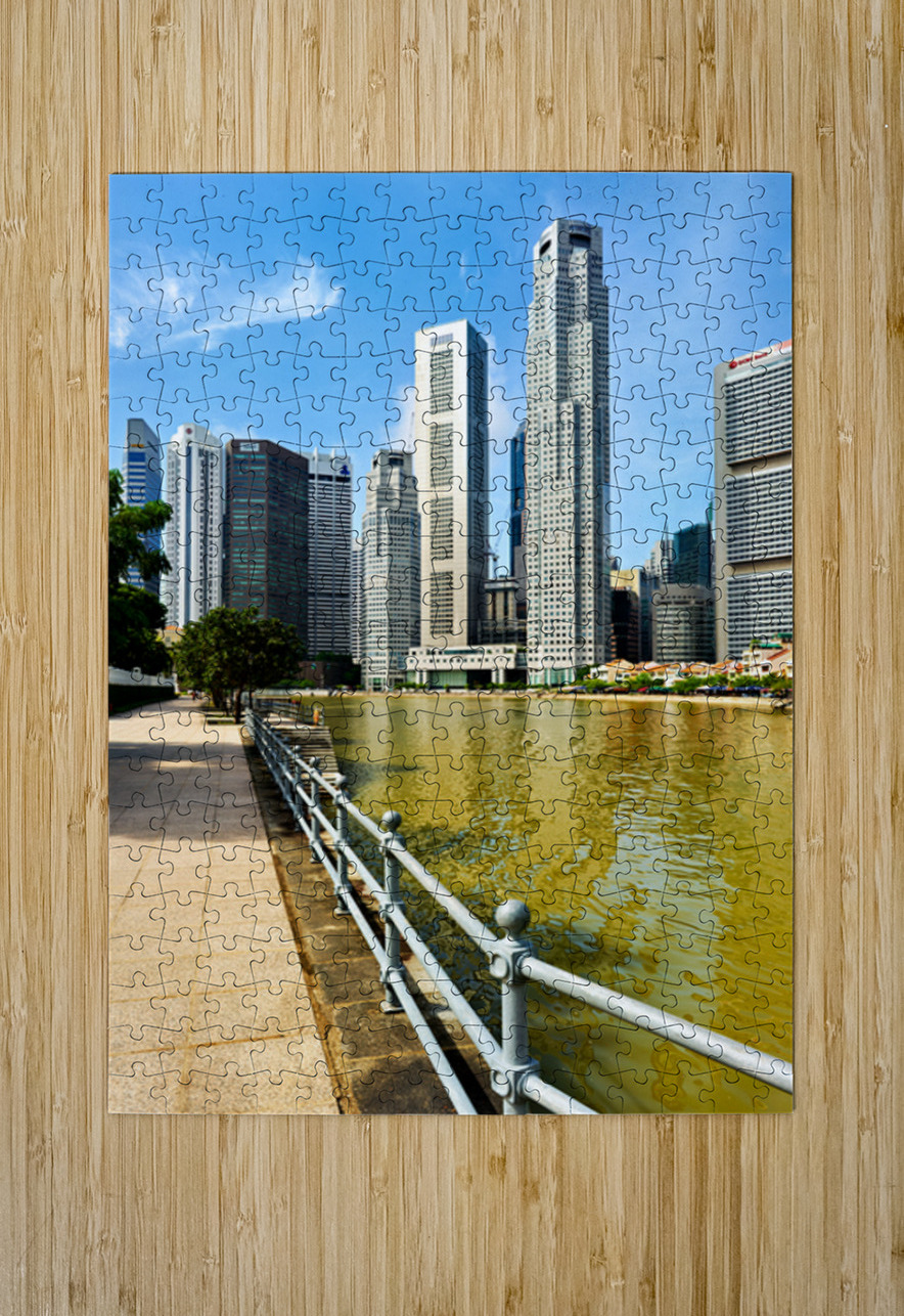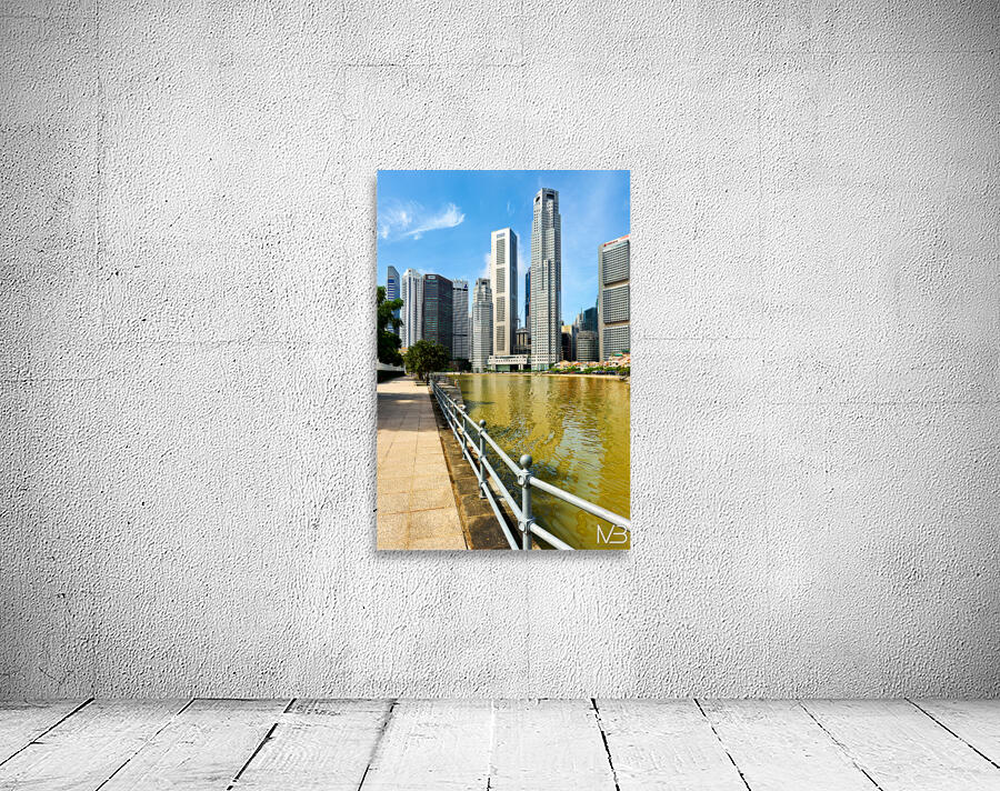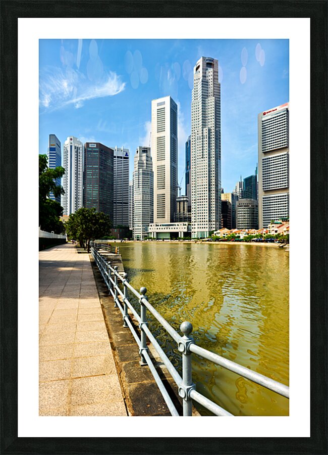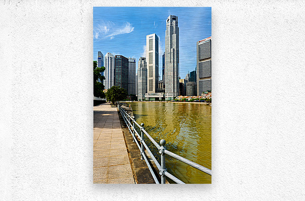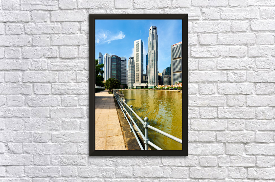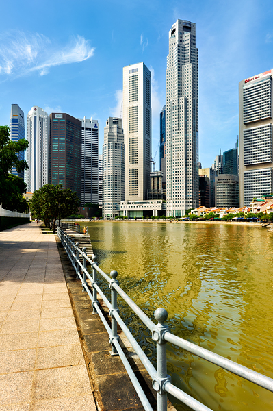 People walk along the canal in Singapore. Tall buildings rise on both sides under a clear sky. Trees add a touch of green to the scene.