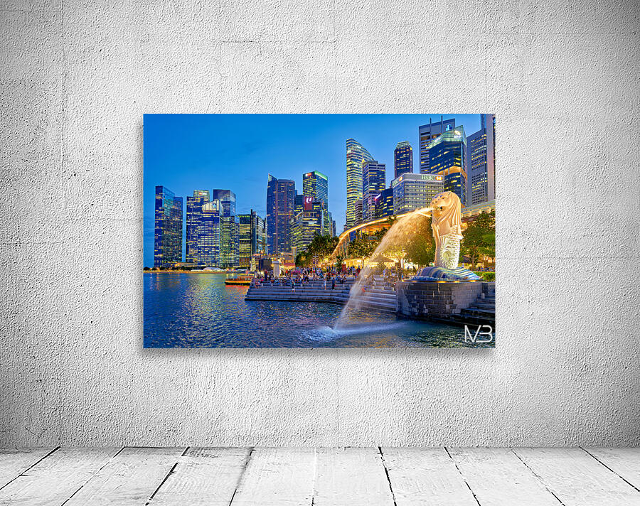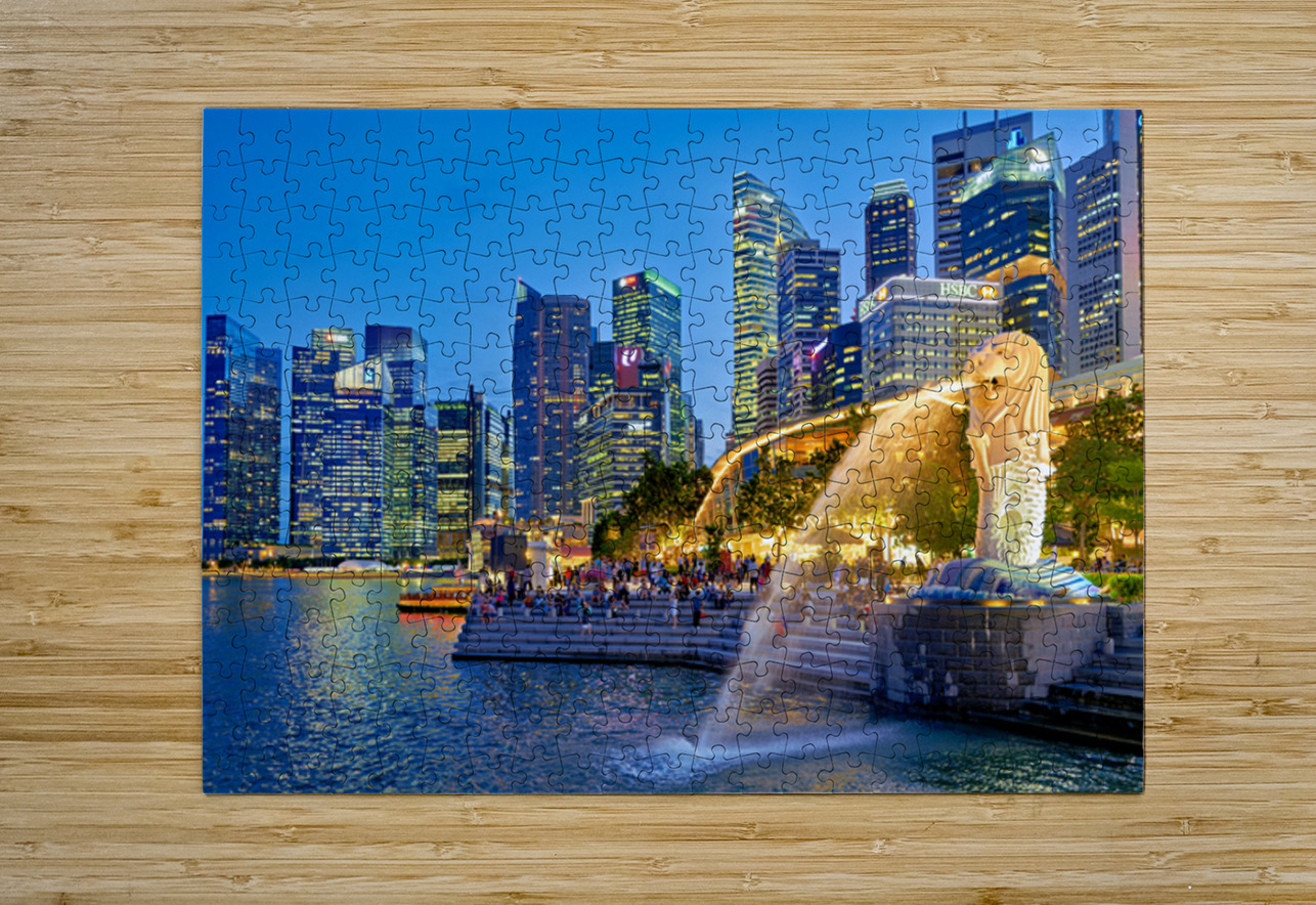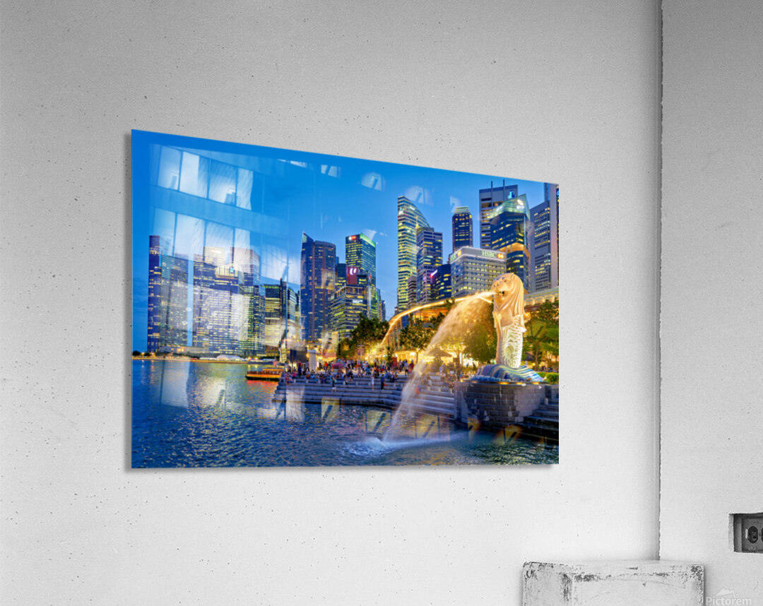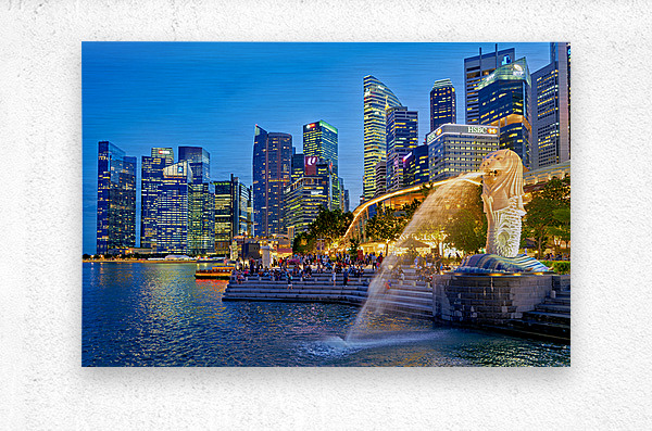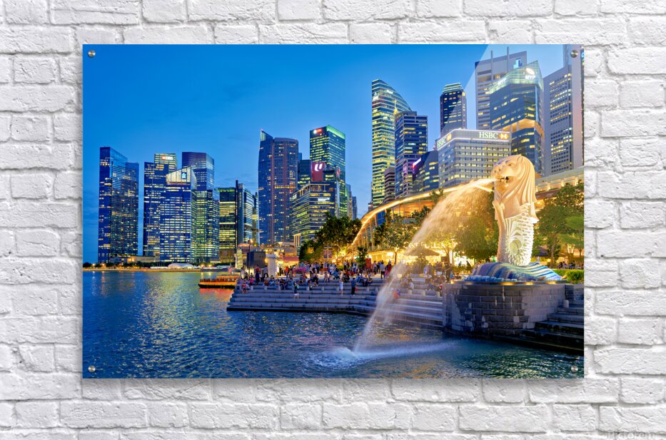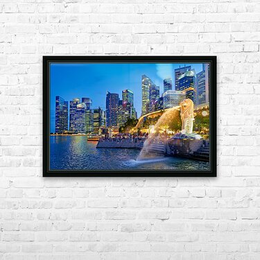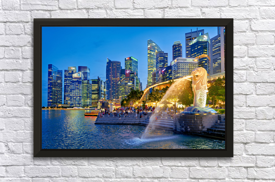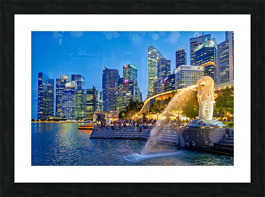 "Visitors enjoy the Merlion fountain near Marina Bay Sands at dus" in a framed print.