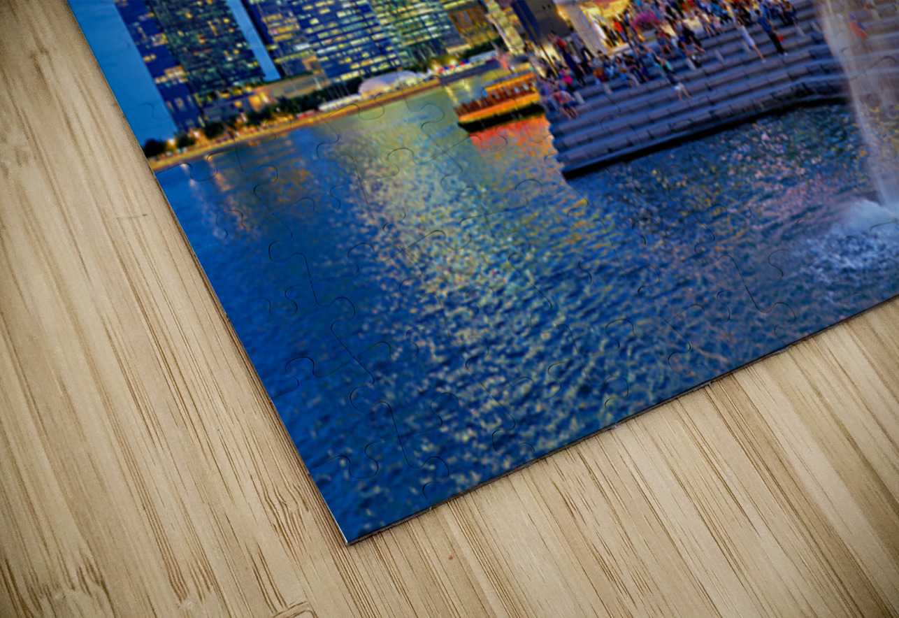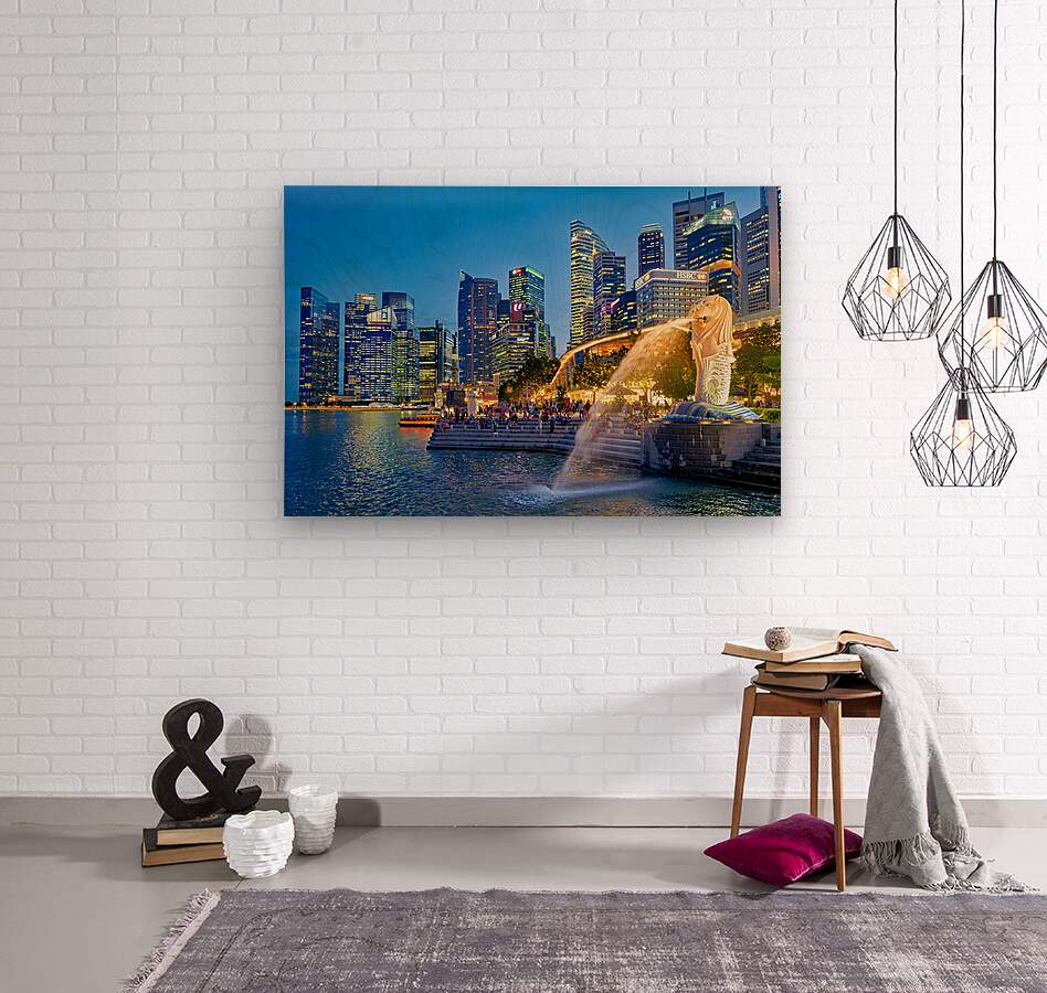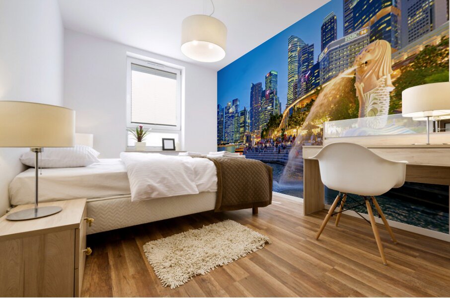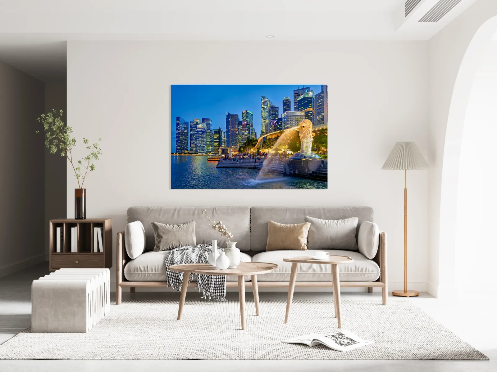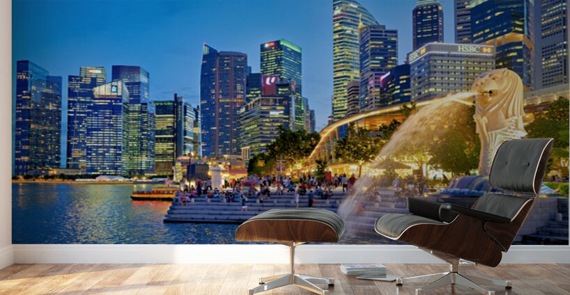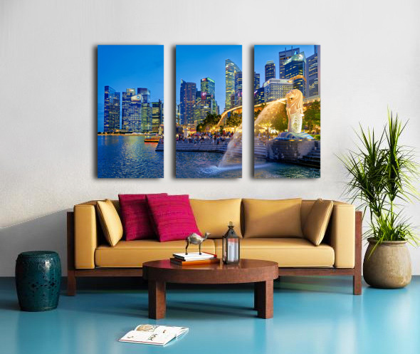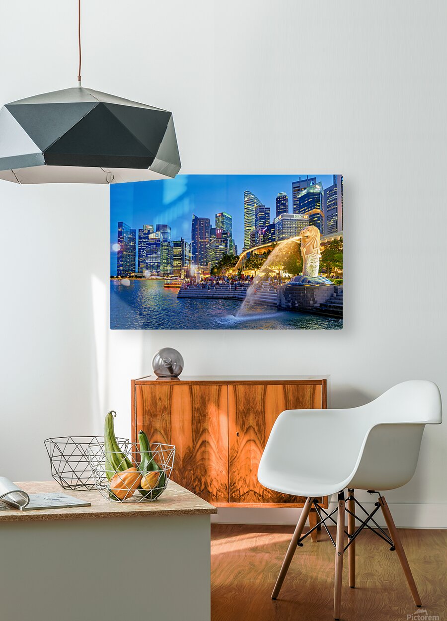 "Visitors enjoy the Merlion fountain near Marina Bay Sands at dus" in a framed print.