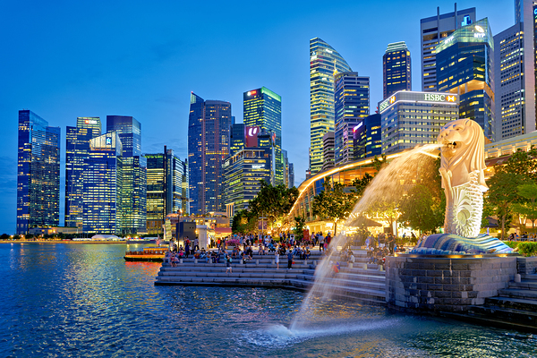 People gather to watch the Merlion fountain in Marina Bay as night approaches. Marina Bay Sands Hotel is visible in the background.