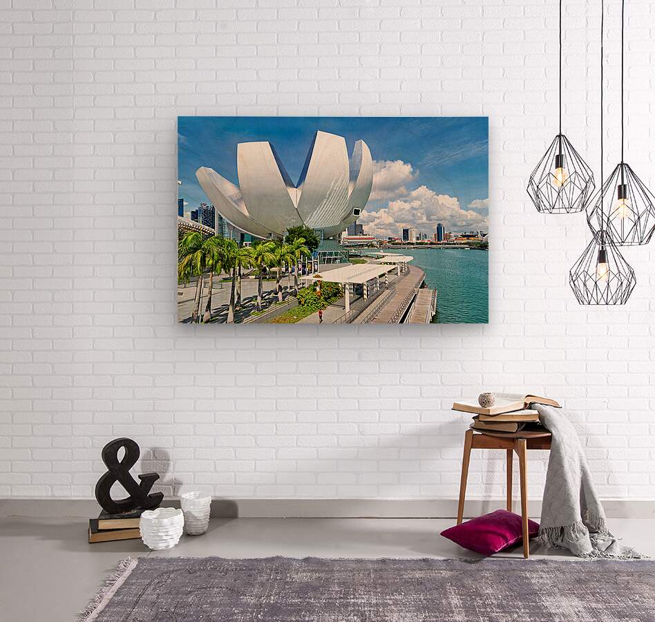 People look at the ArtScience Museum in Singapore. The city skyline is in the background on a clear day. The scene includes greenery and water.