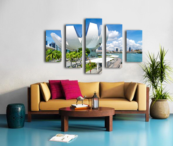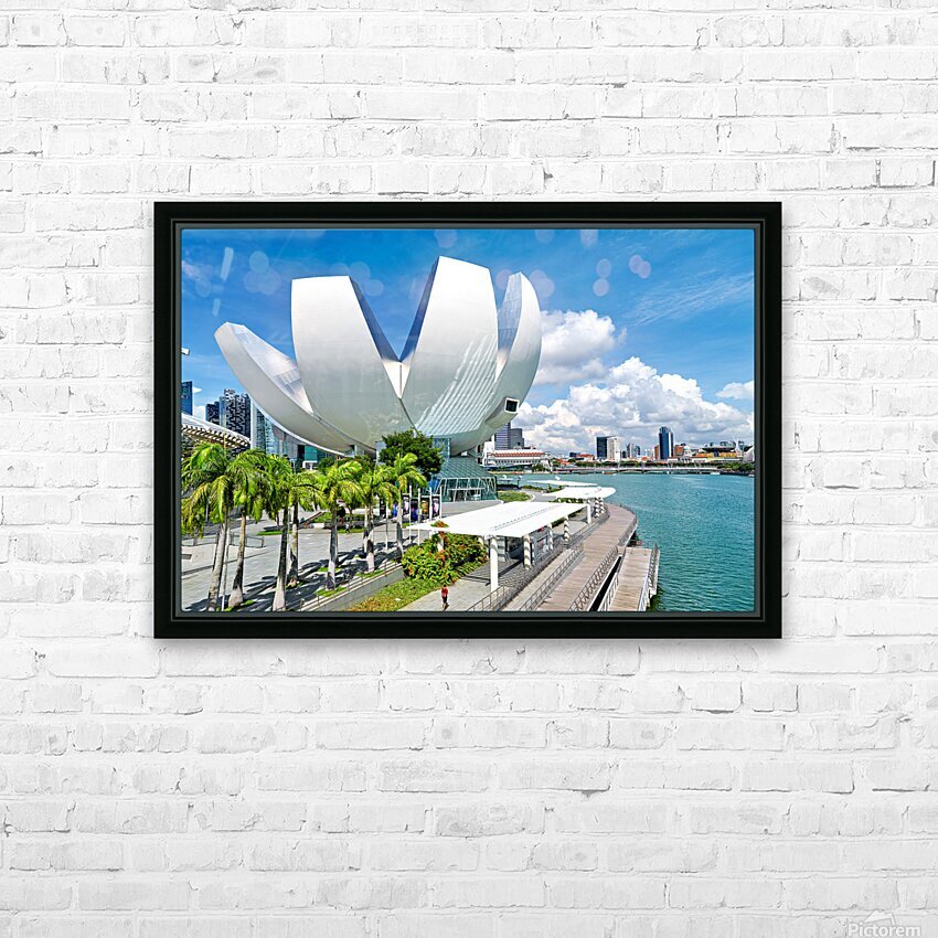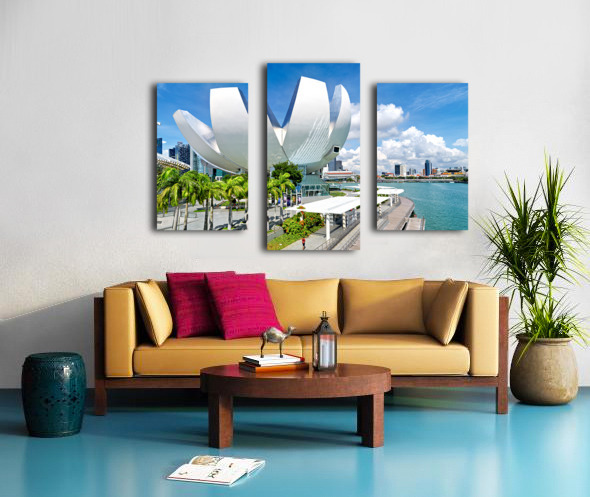 Visitors enjoy view of ArtScience Museum in Singapore near water Frame print