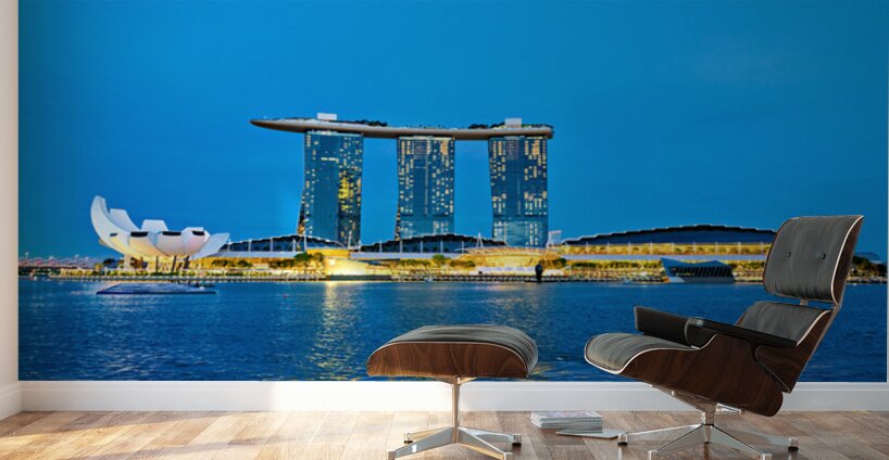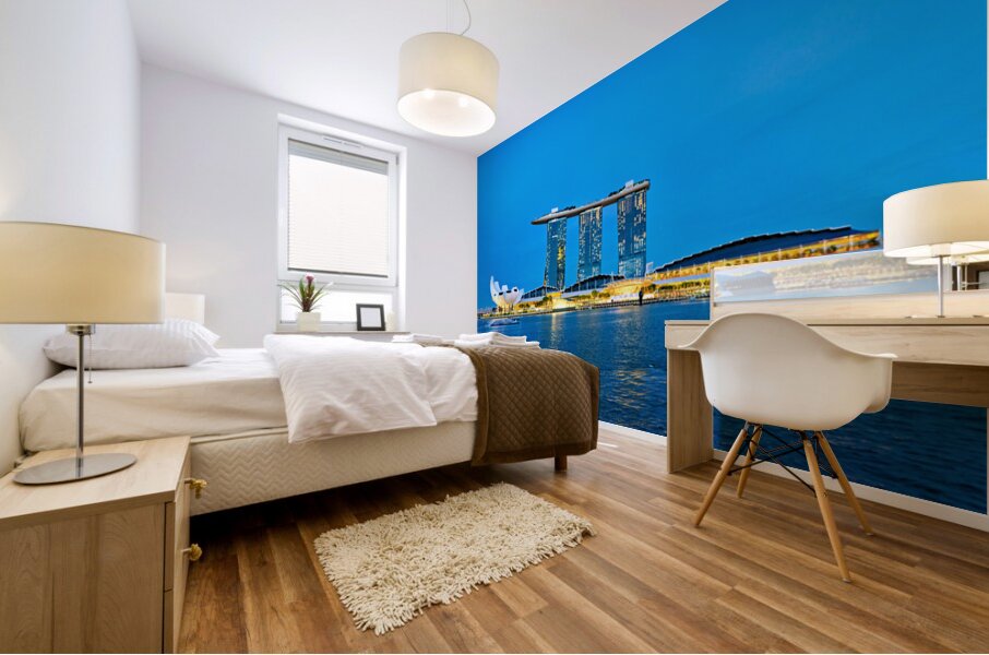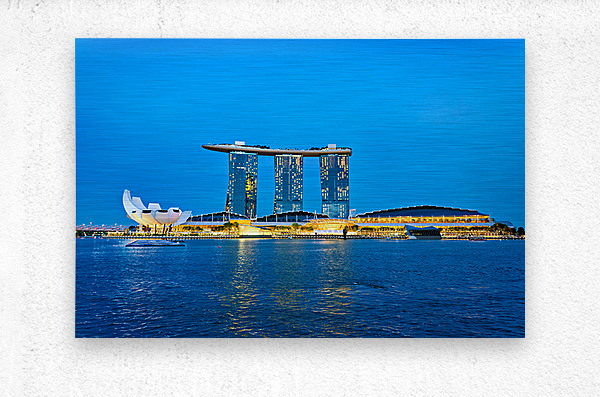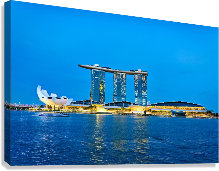 ABOUT THIS ARTWORK: CITY SKYLINE AT SUNSET OVER MARINA BAY WITH REFLECTIONS ON WATER