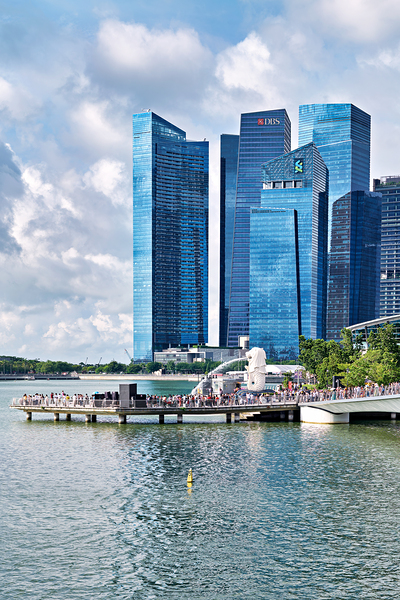 People walk near a bridge in Singapores financial district. Tall buildings rise in the background under a clear sky with green trees.