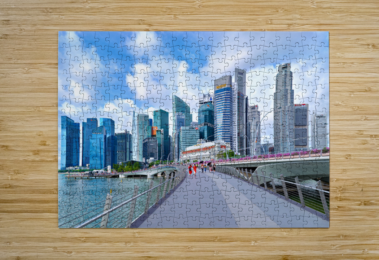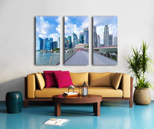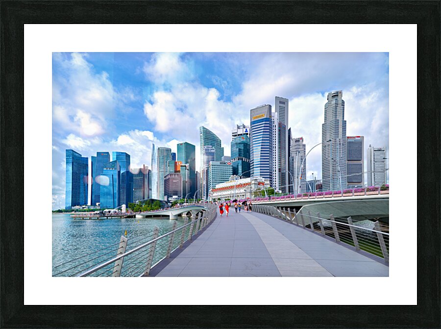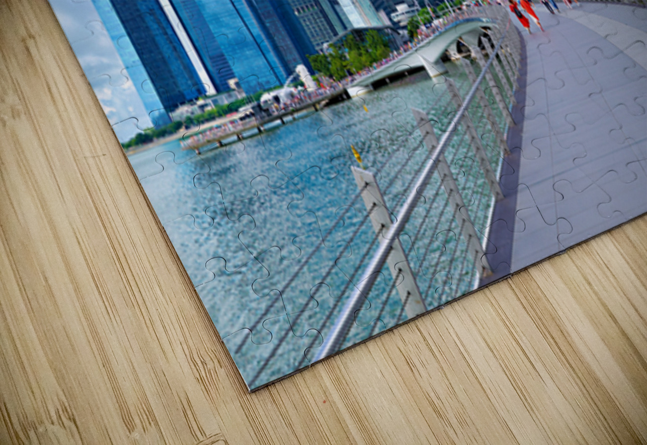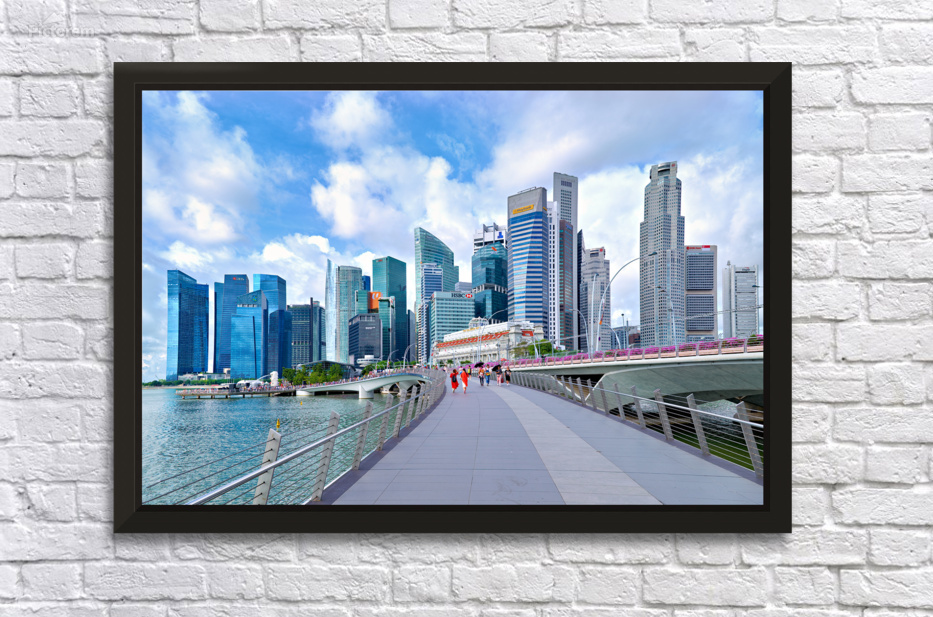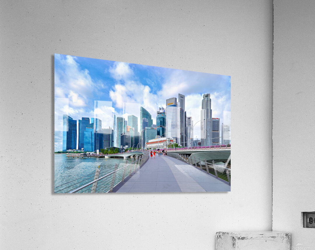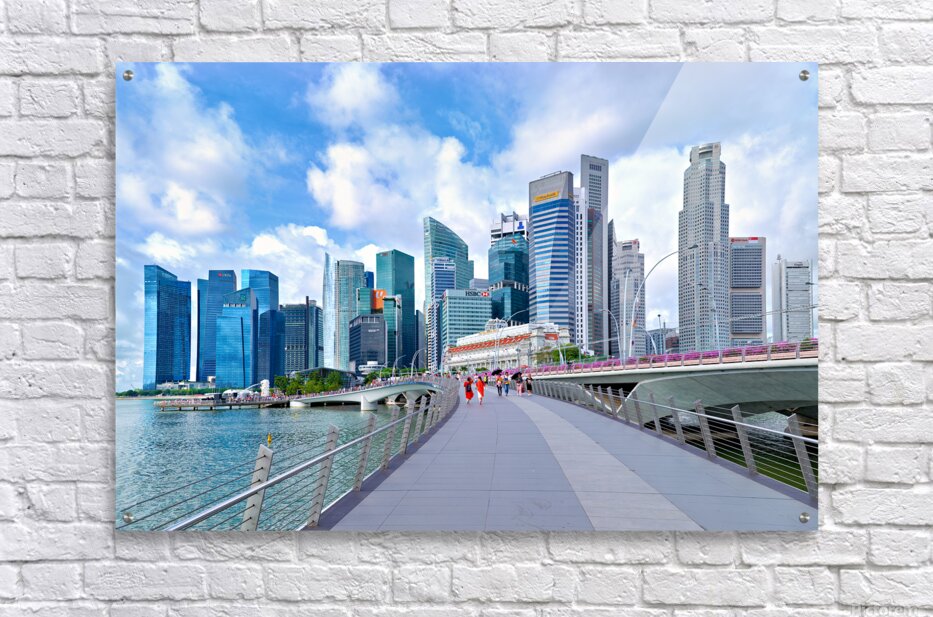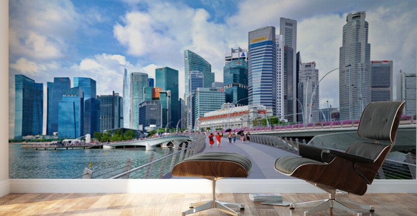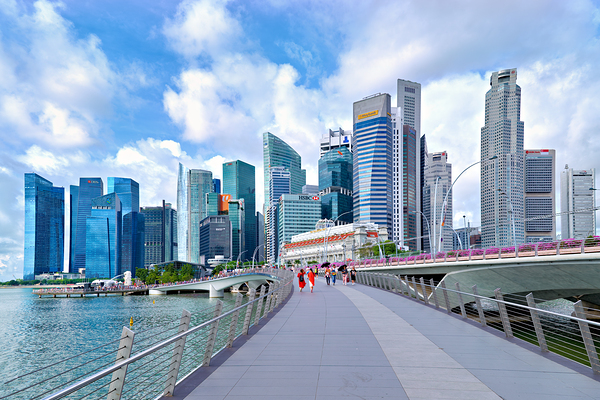 Crowds stroll along a bridge in Singapores busy financial district with tall buildings around. The sky is clear and trees are green.