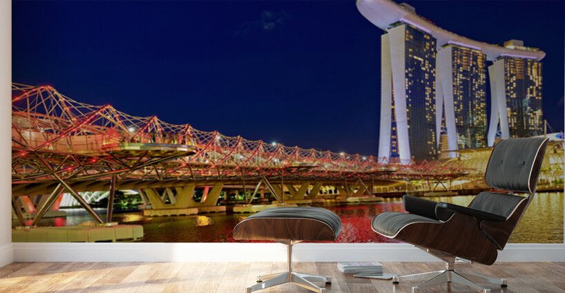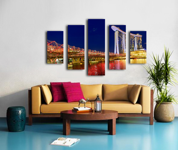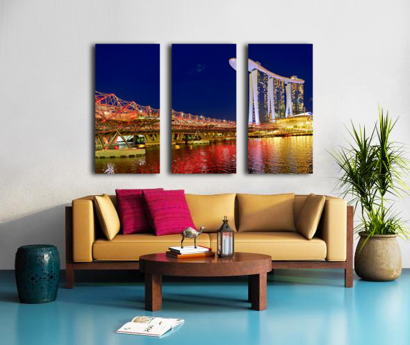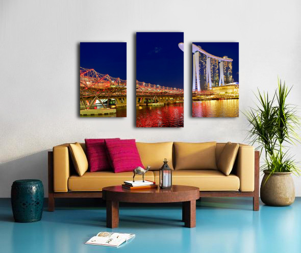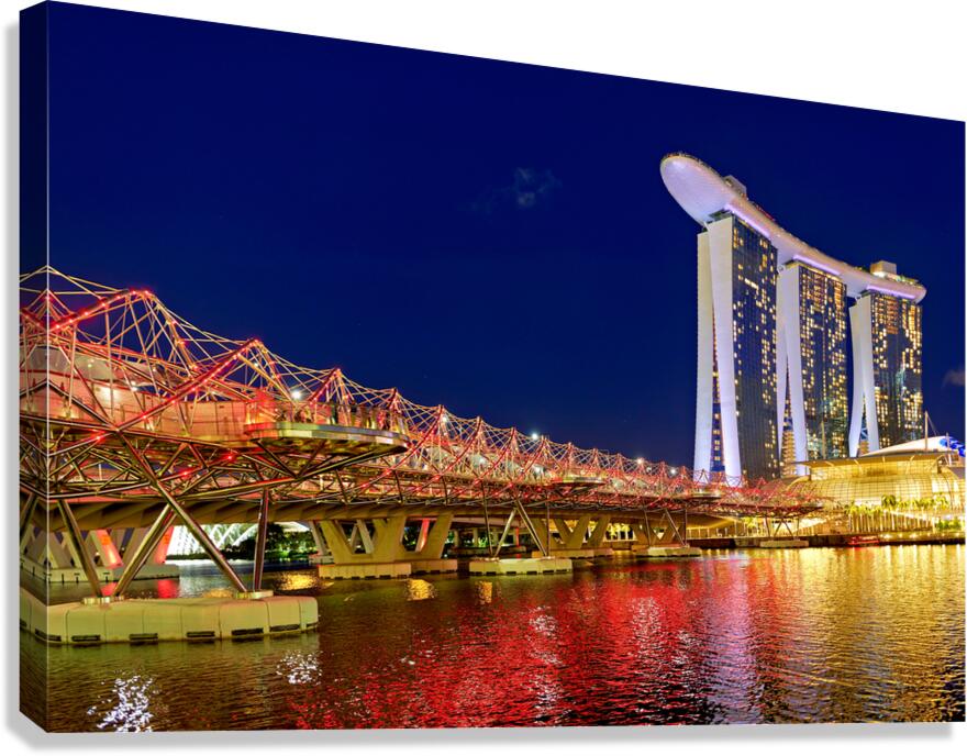 People walk across the Helix Bridge as the Marina Bay Sands Hotel shines at sunset. The sky turns orange and lights reflect in the water. Canvas print