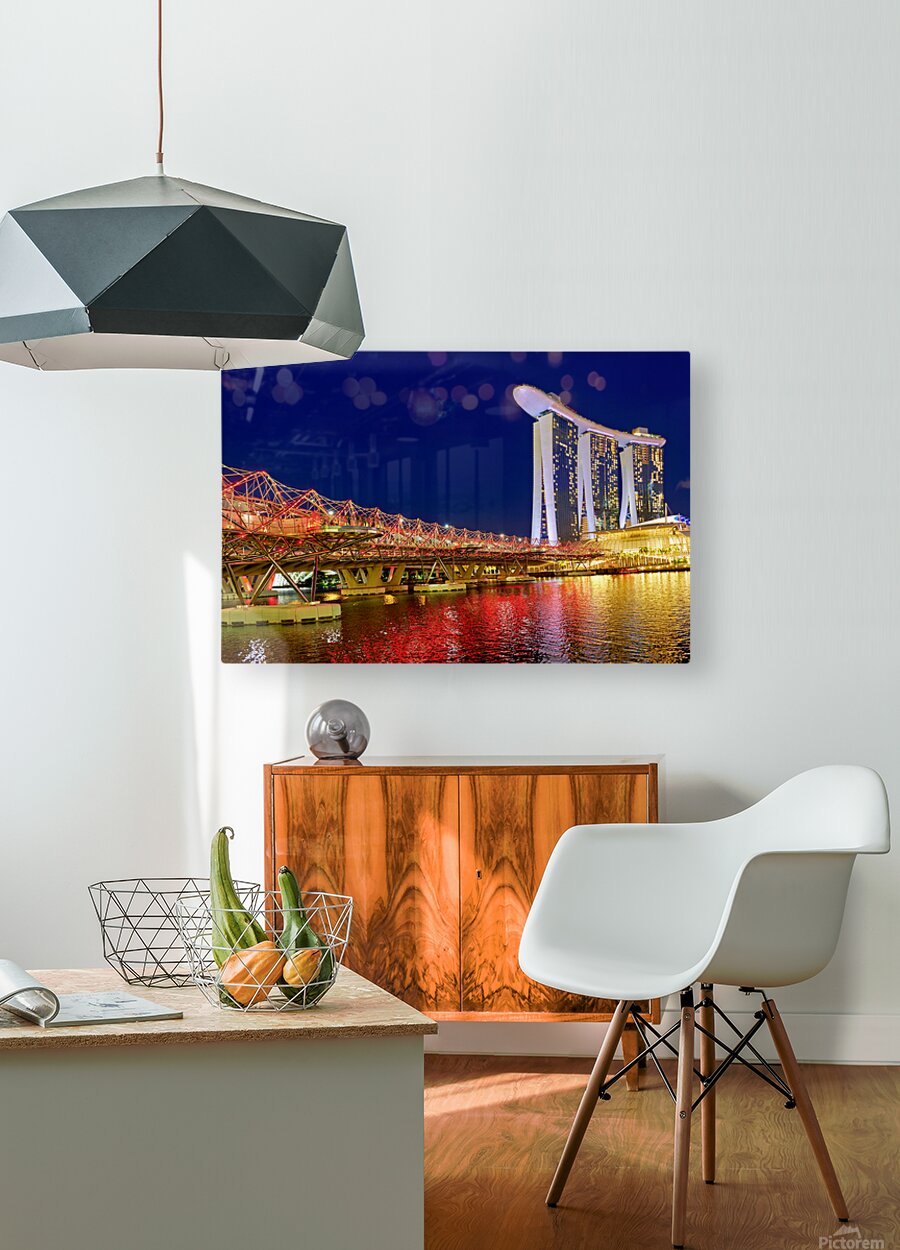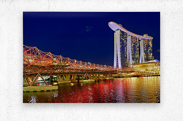 ABOUT THIS ARTWORK: PEOPLE WALK ACROSS THE HELIX BRIDGE AS THE MARINA BAY SANDS HOTEL SHINES AT SUNSET. THE SKY TURNS ORANGE AND LIGHTS REFLECT IN THE WATER.