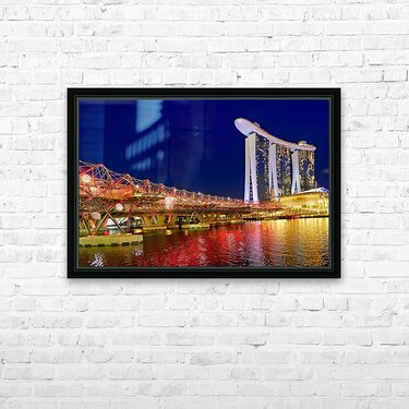 People walk across the Helix Bridge as the Marina Bay Sands Hotel shines at sunset. The sky turns orange and lights reflect in the water. Picture Frame Printing