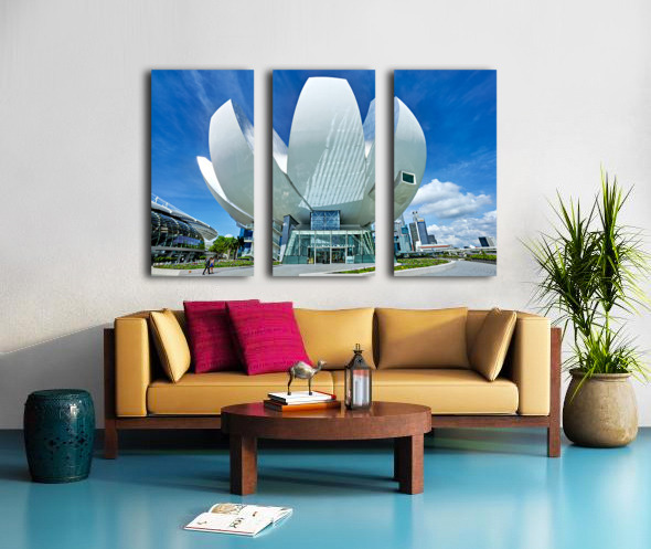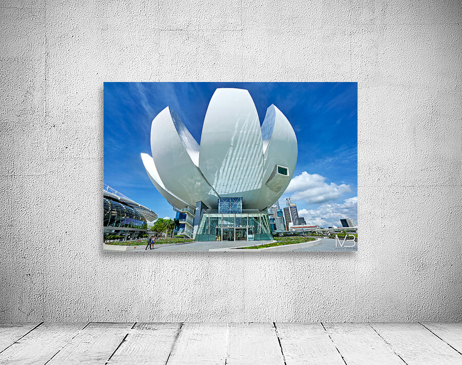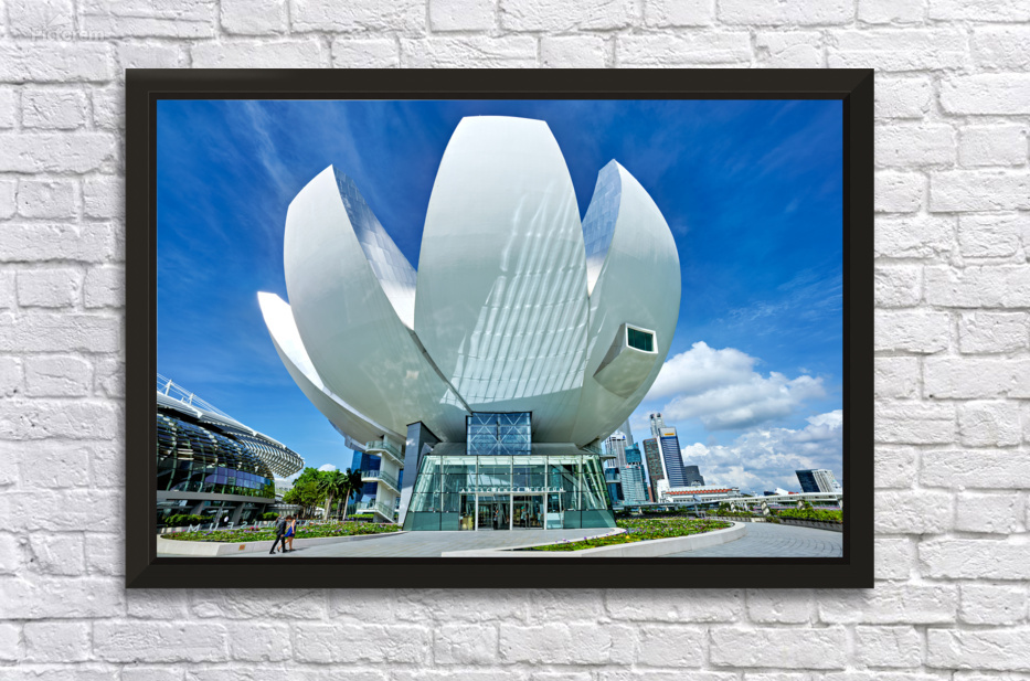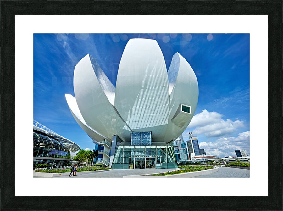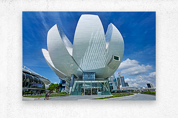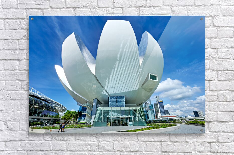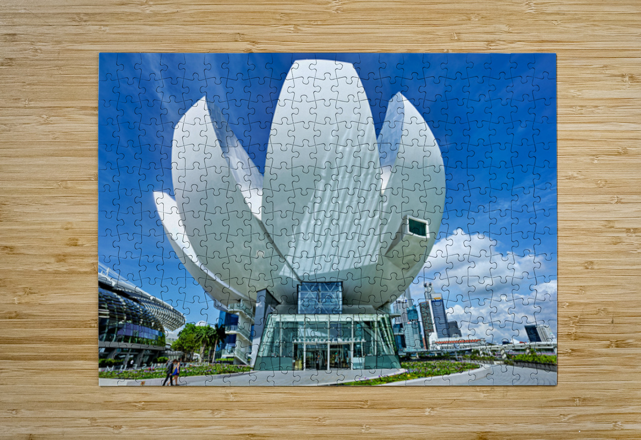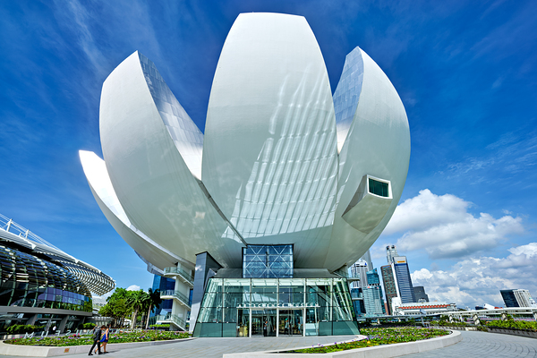 Visitors stand by the water enjoying the view of ArtScience Museum in Singapore. The city skyline is visible under a clear blue sky.