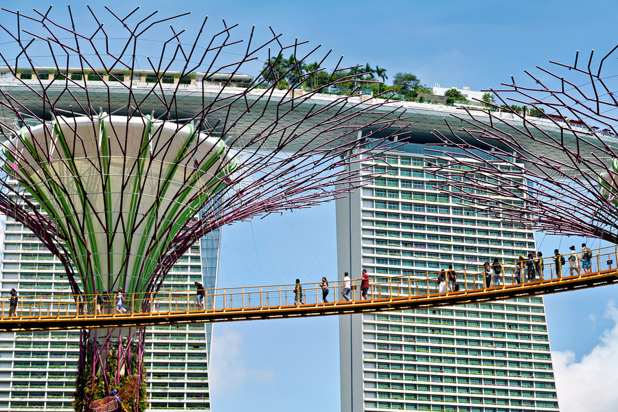 Groups of visitors enjoy a walk on the bridge at Supertree Grove with city buildings in the background under a clear sky.