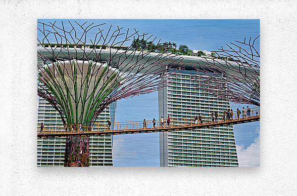 ABOUT THIS ARTWORK: PEOPLE WALK ON BRIDGE CONNECTING TO SUPERTREE GROVE IN SINGAPORE