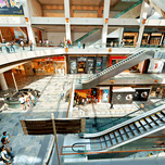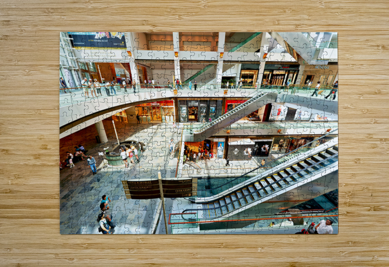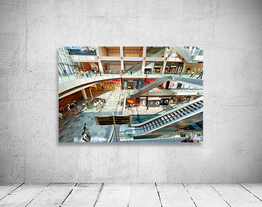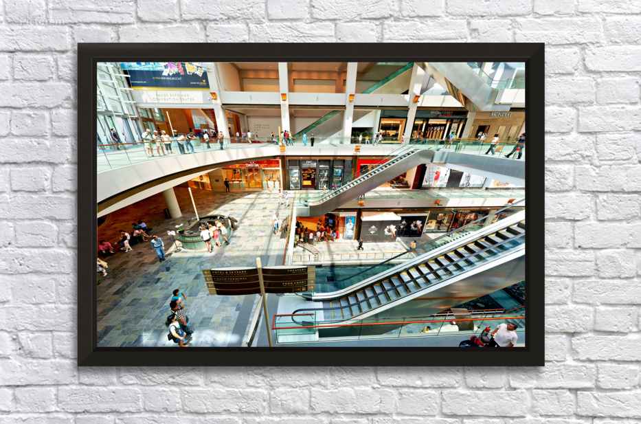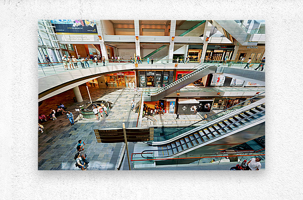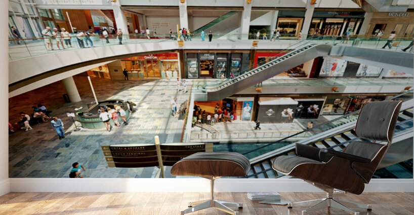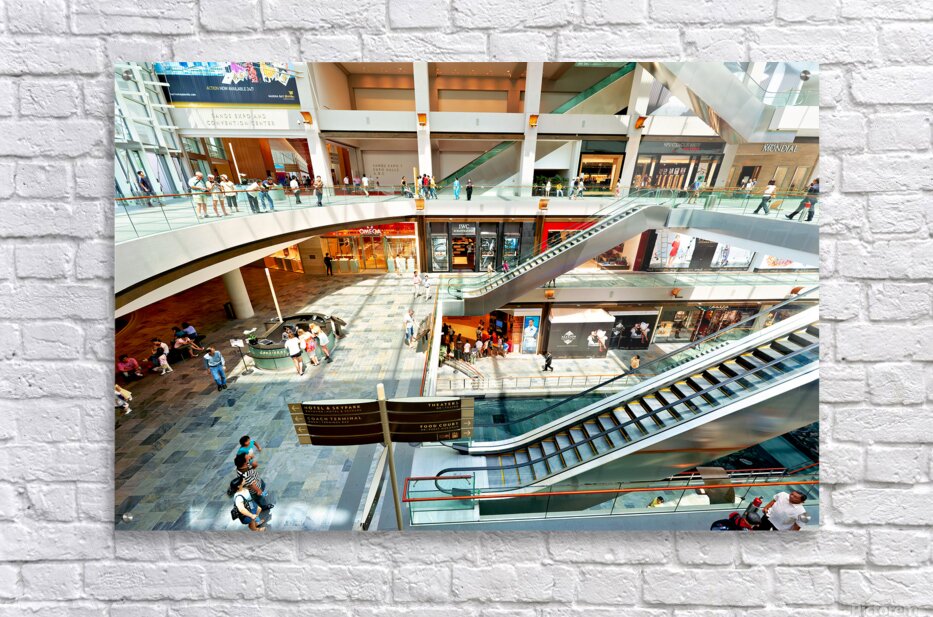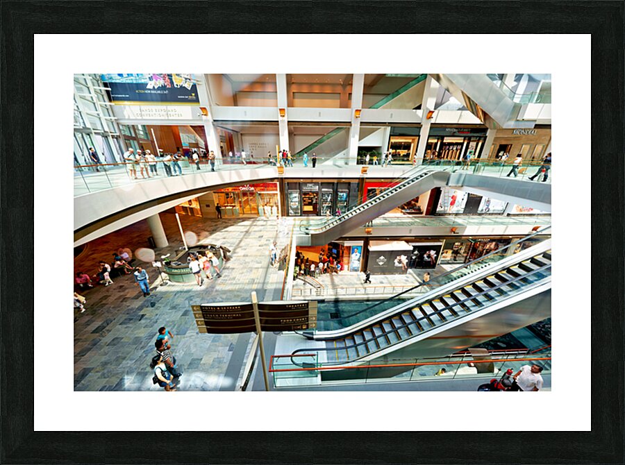 Shoppers browse stores at Marina Bay Sands Mall in Singapore. Escalators and signs help guide visitors through the busy space.