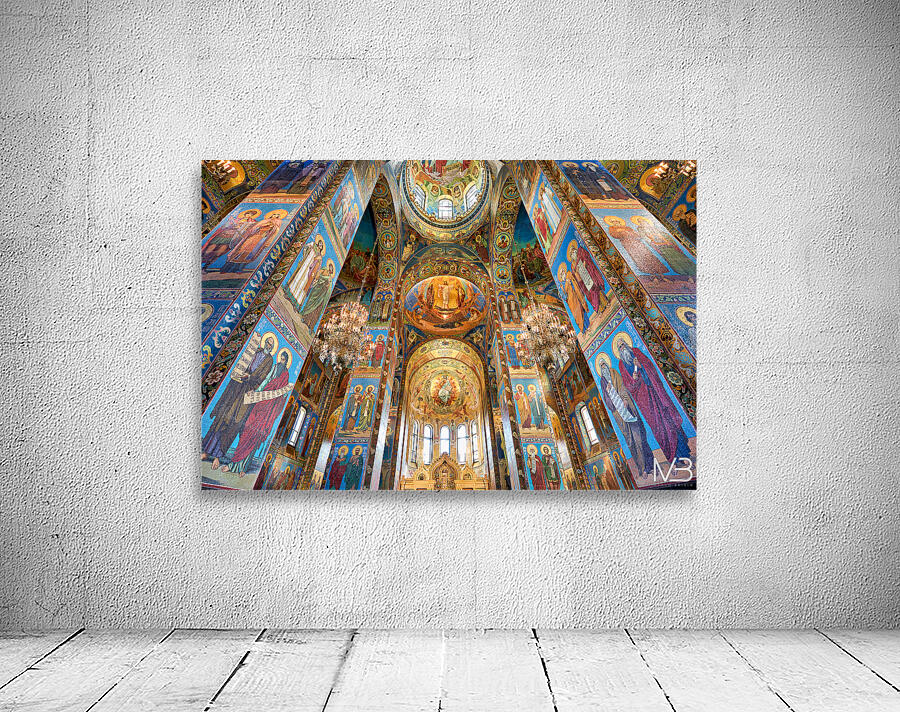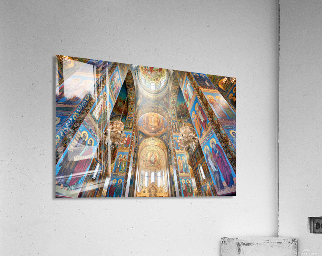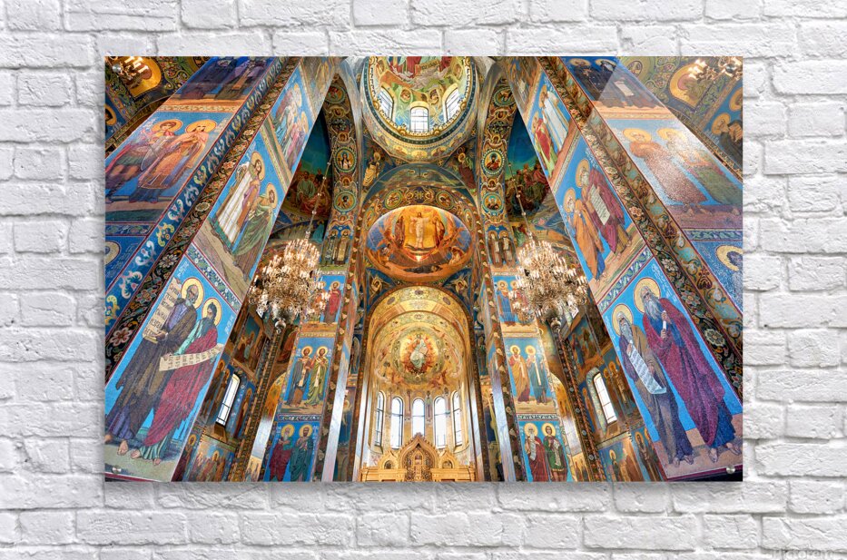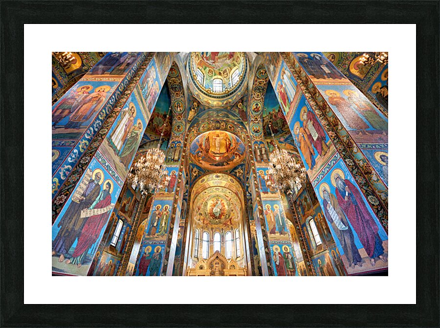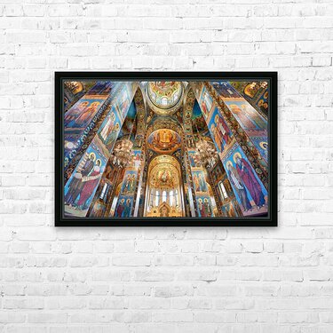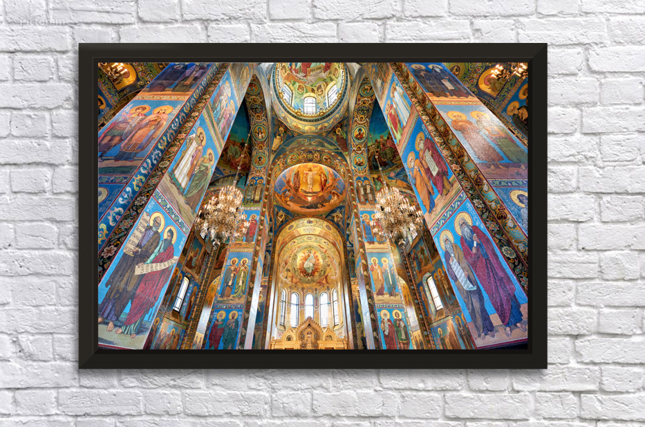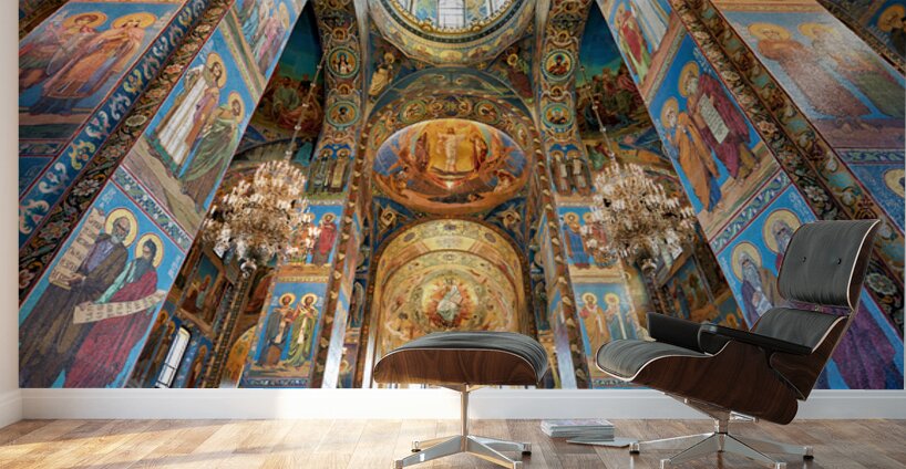 Inside the Church of the Savior on the Spilled Blood visitors see colorful murals on the walls and decorative chandeliers overhead.