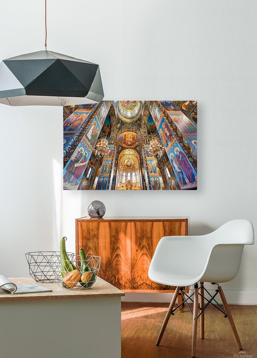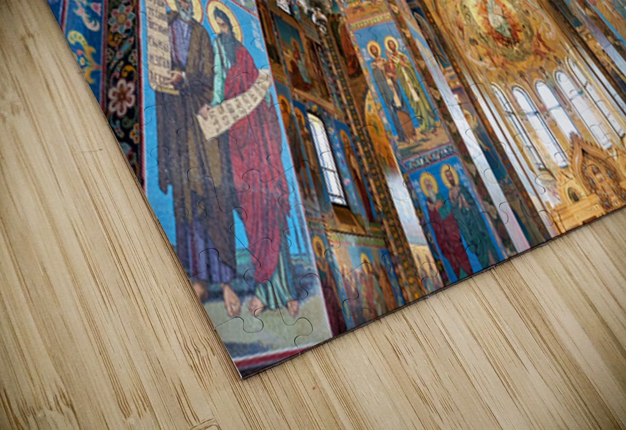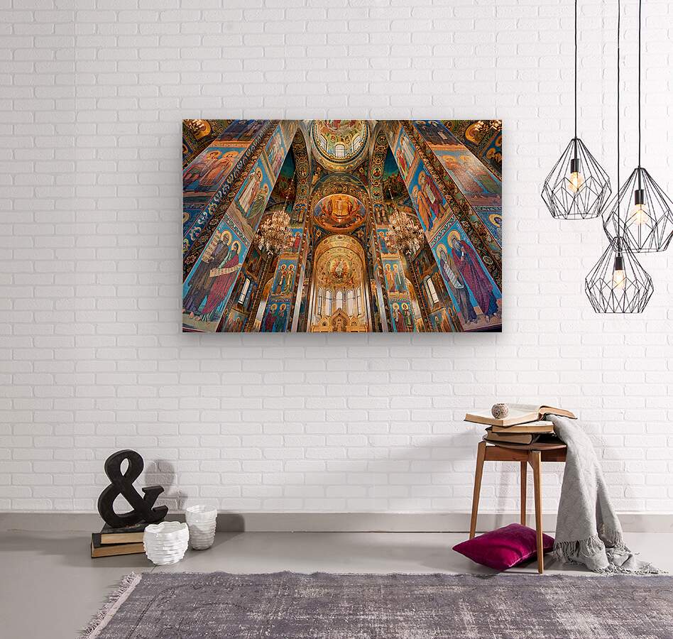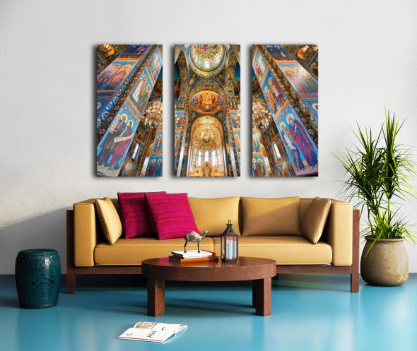 Inside the Church of the Savior on the Spilled Blood visitors see colorful murals on the walls and decorative chandeliers overhead.