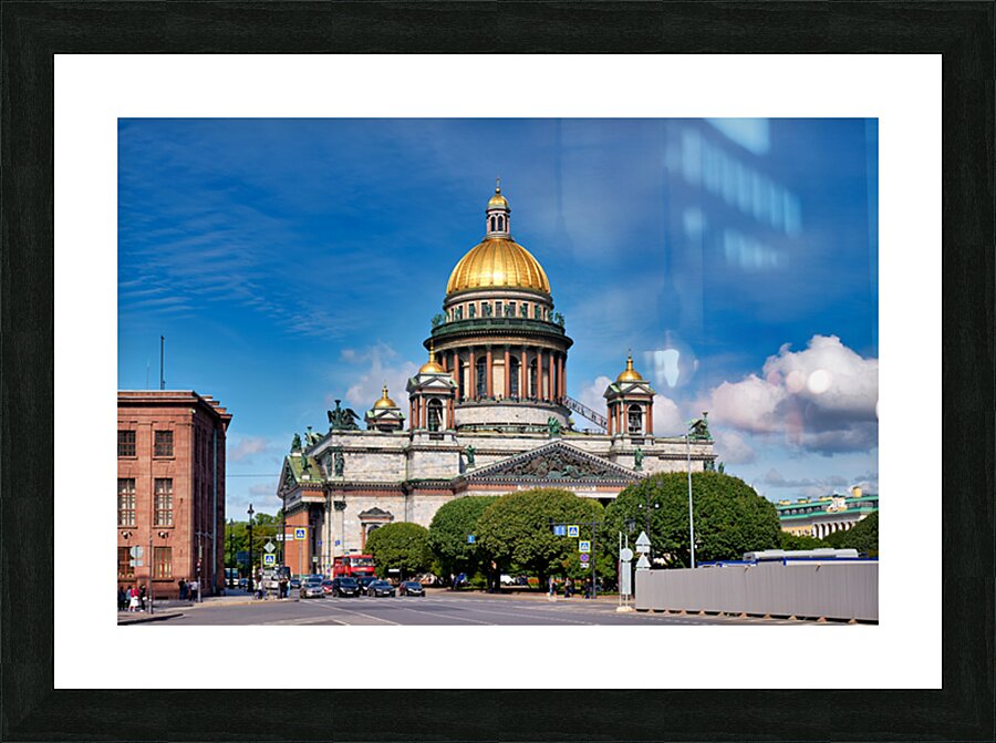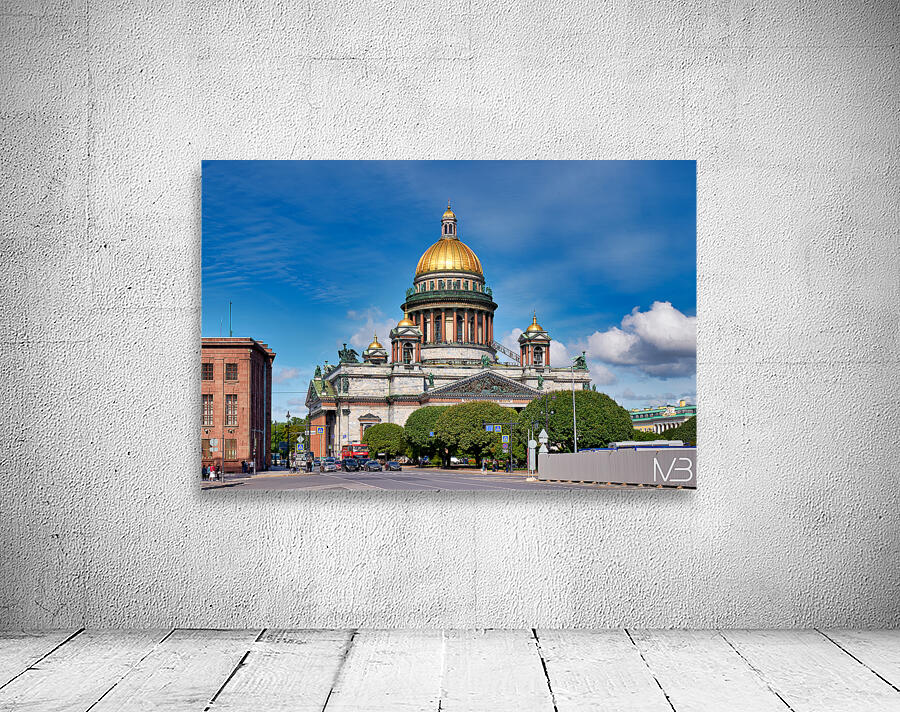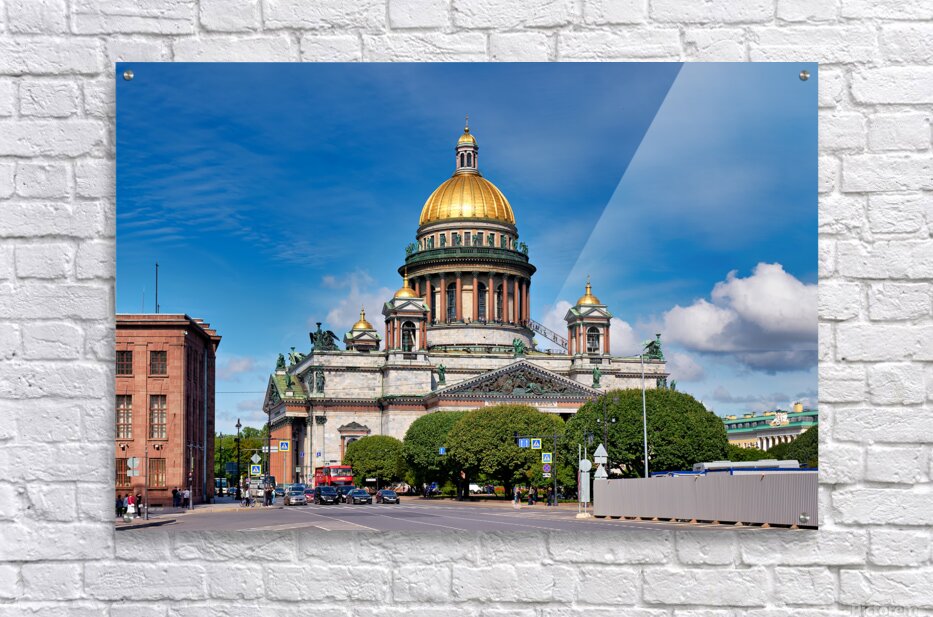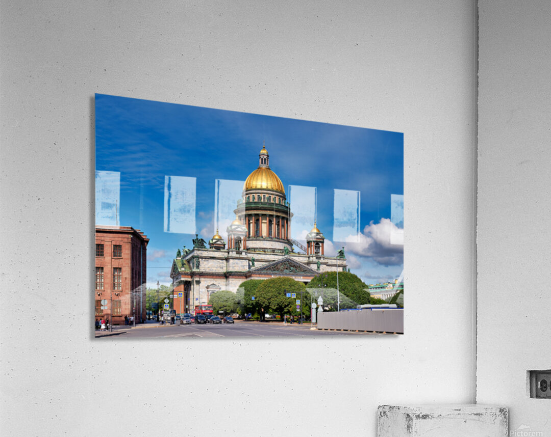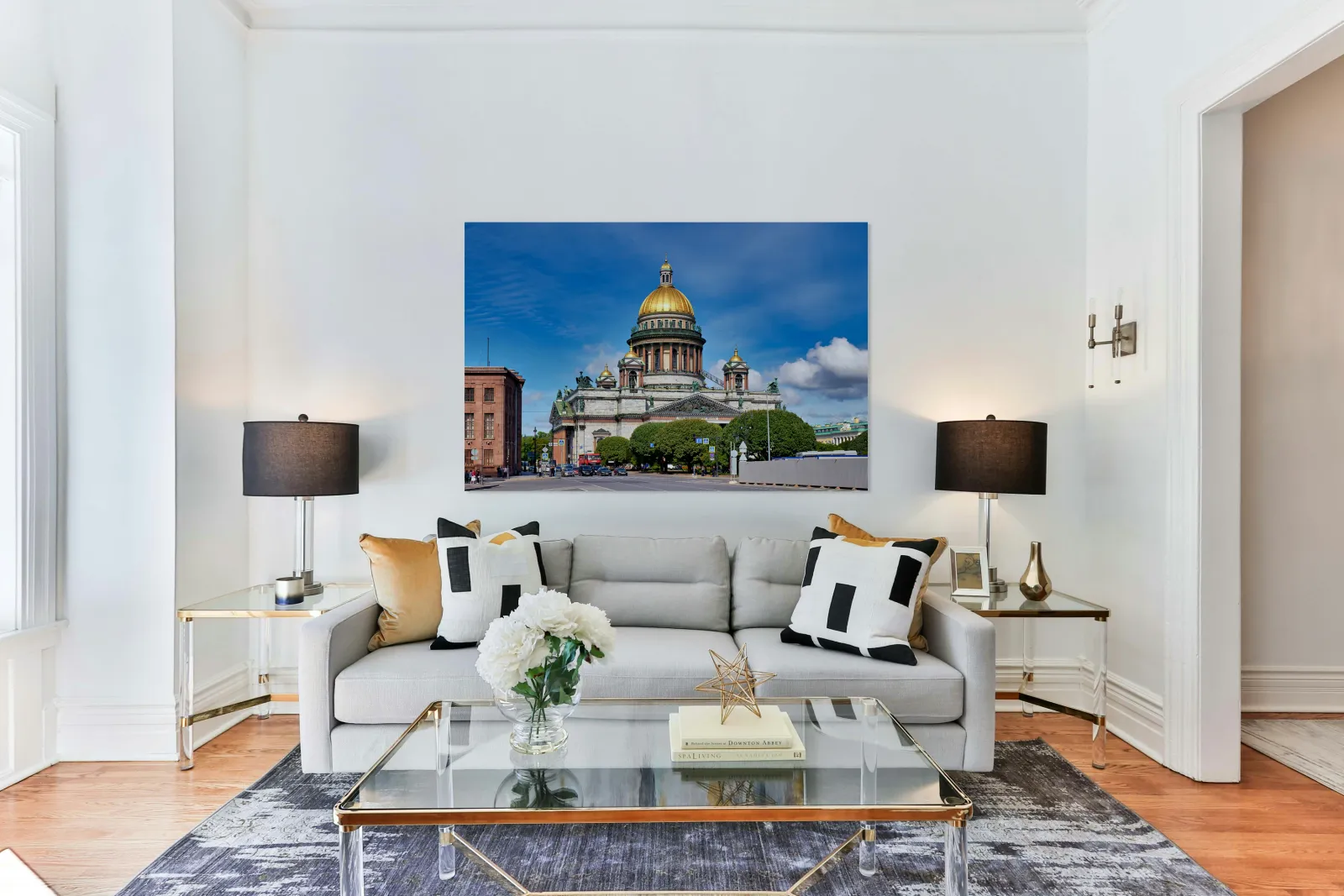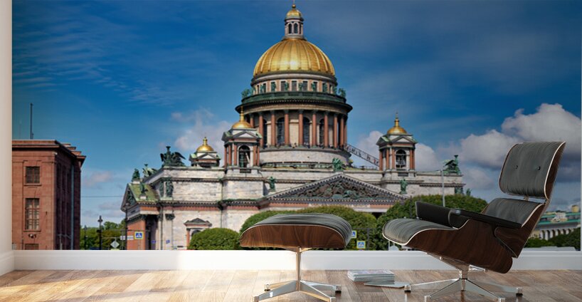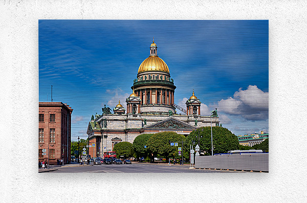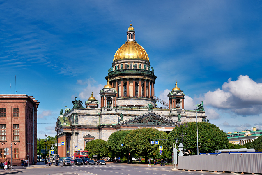 Saint Isaacs Cathedral is located in Saint Petersburg Russia. The structure showcases a golden dome and impressive architecture.