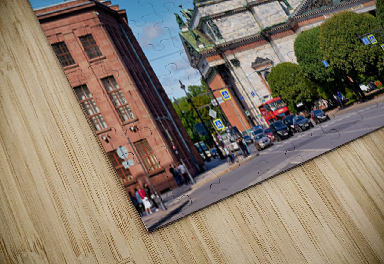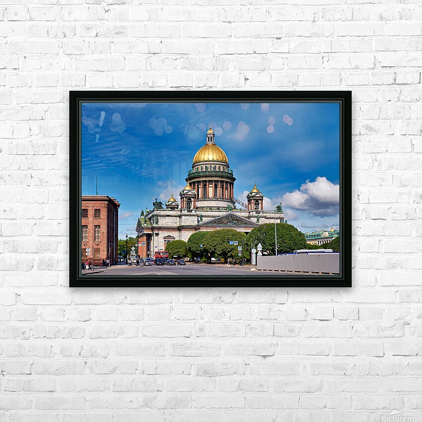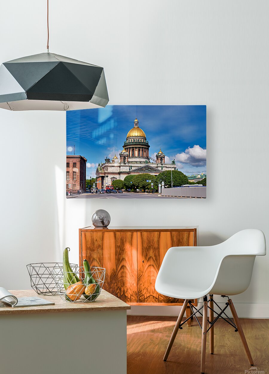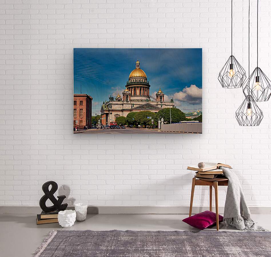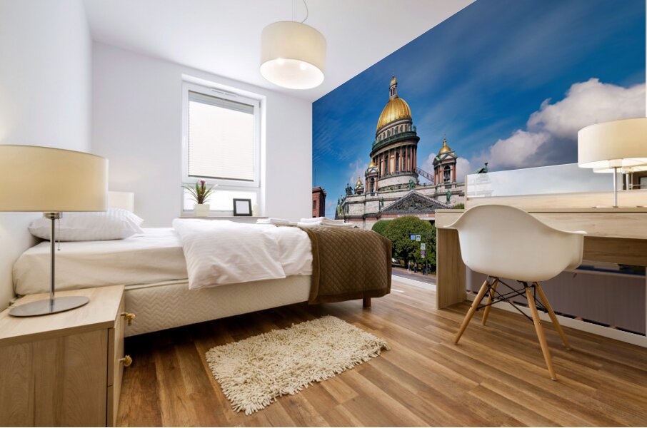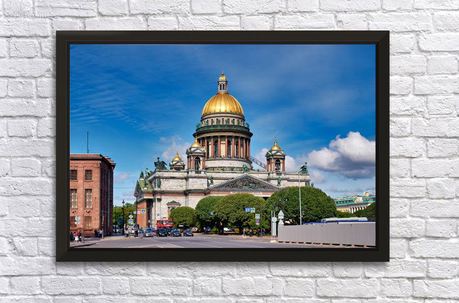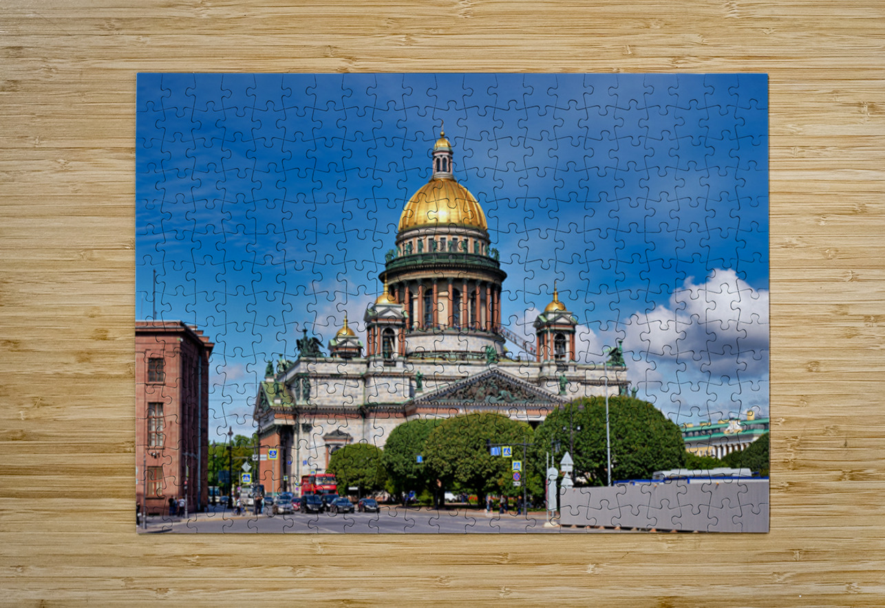 Saint Isaacs Cathedral is located in Saint Petersburg Russia. The structure showcases a golden dome and impressive architecture.