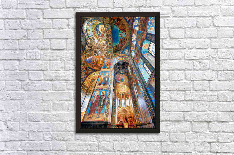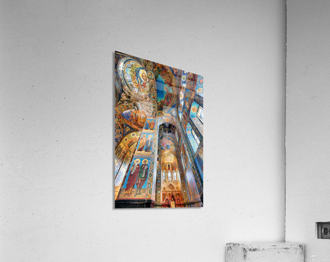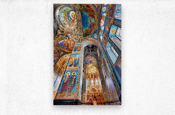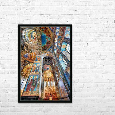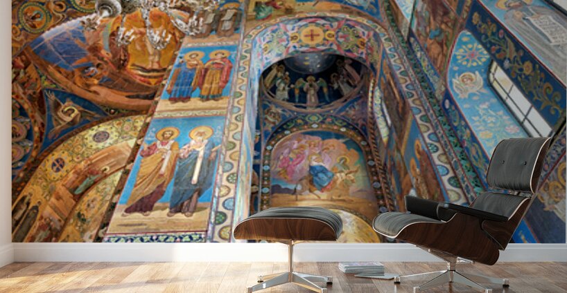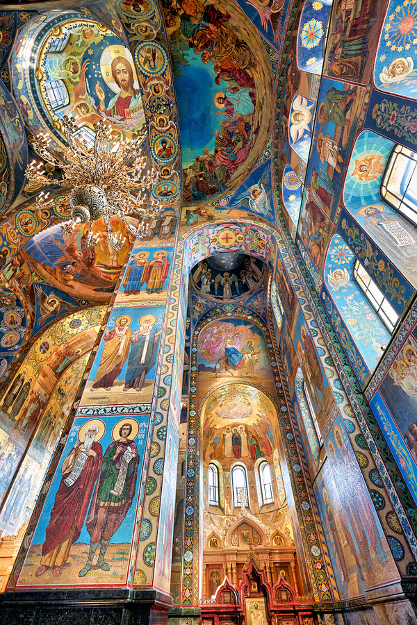 Visitors explore the rich interior of the Church of the Savior on the Spilled Blood in St. Petersburg. Colorful mosaics cover the walls and ceiling.
