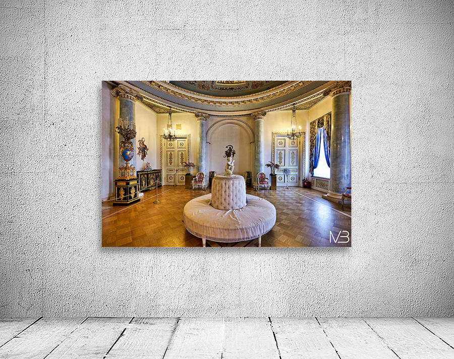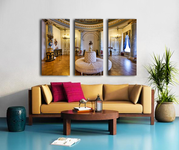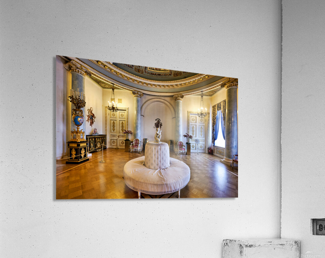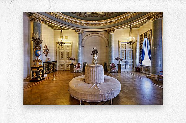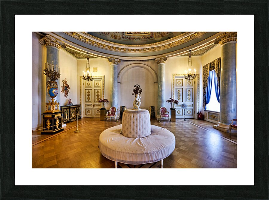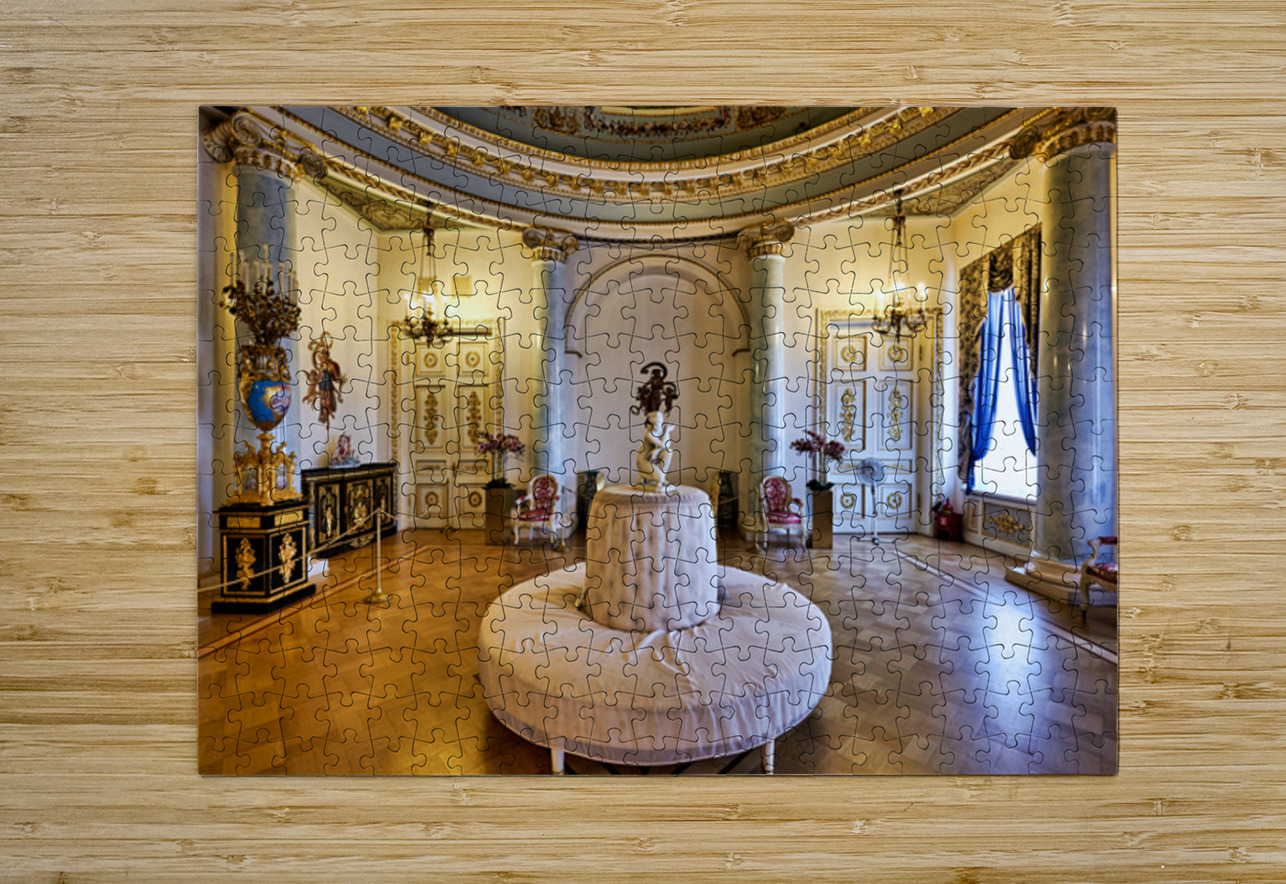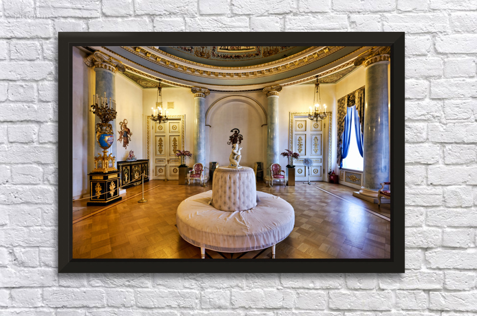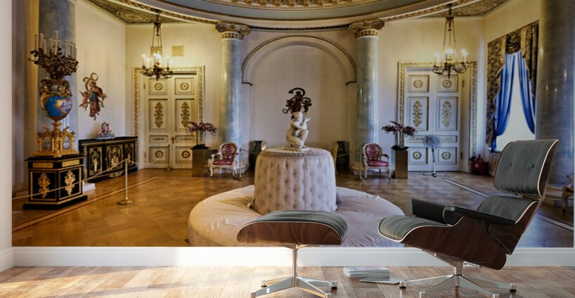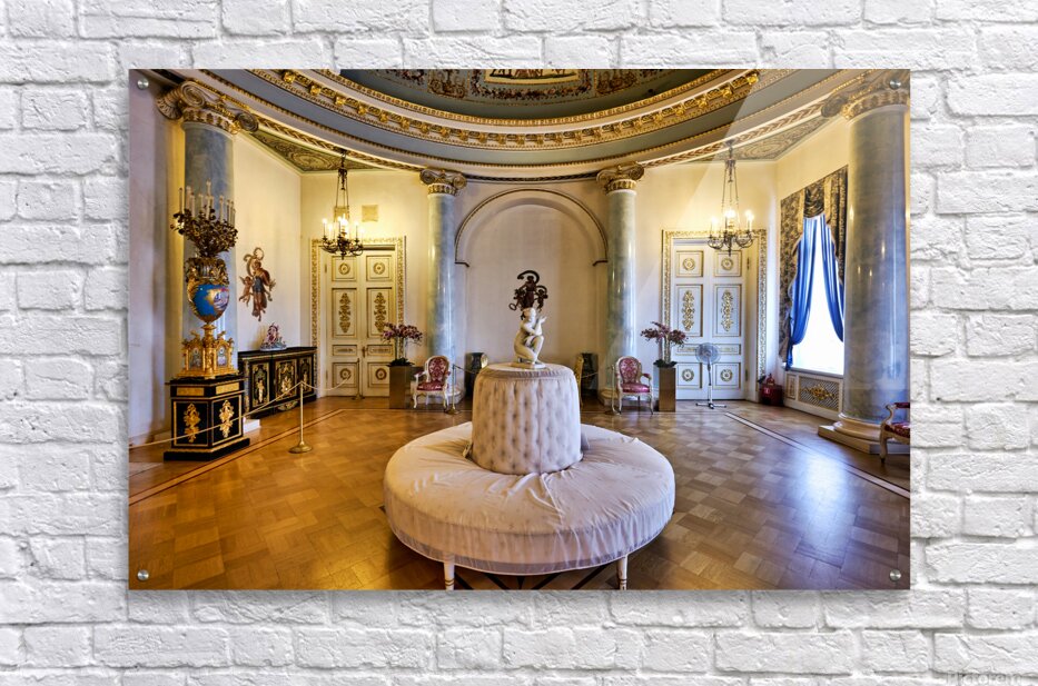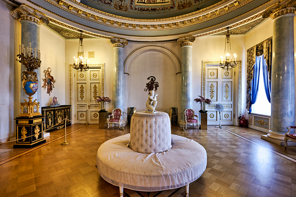Visitors view the interior of Yusupov Palace in St. Petersburg. The room features a statue and elegant decor.