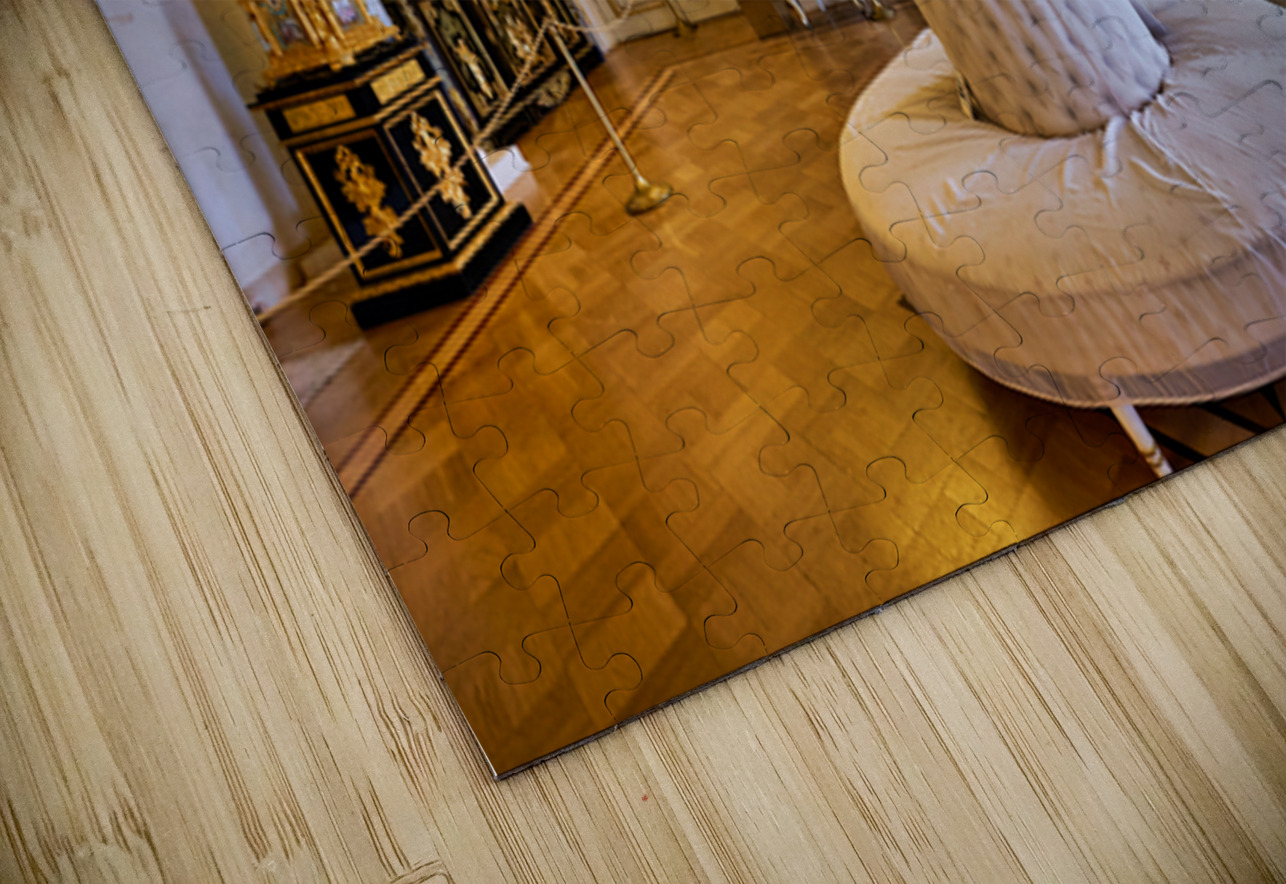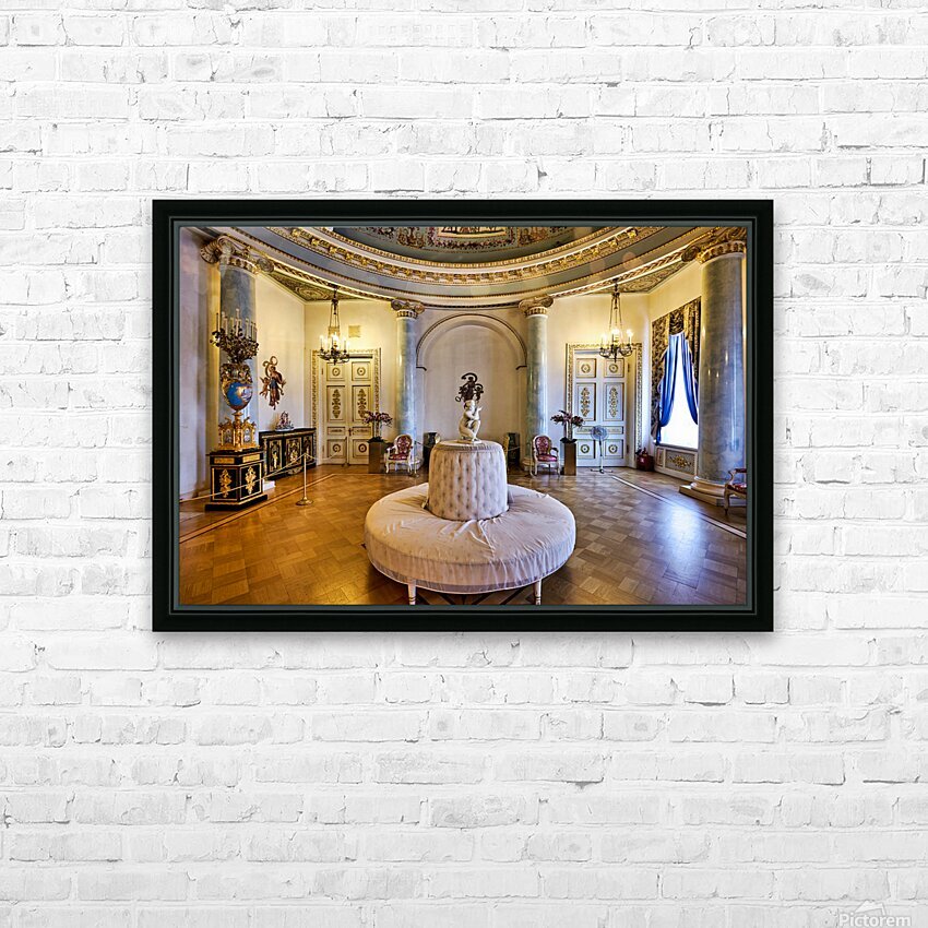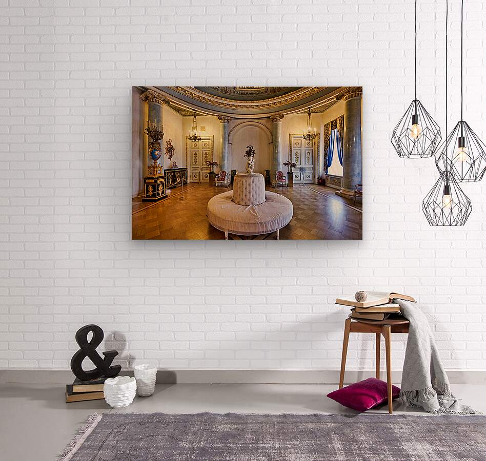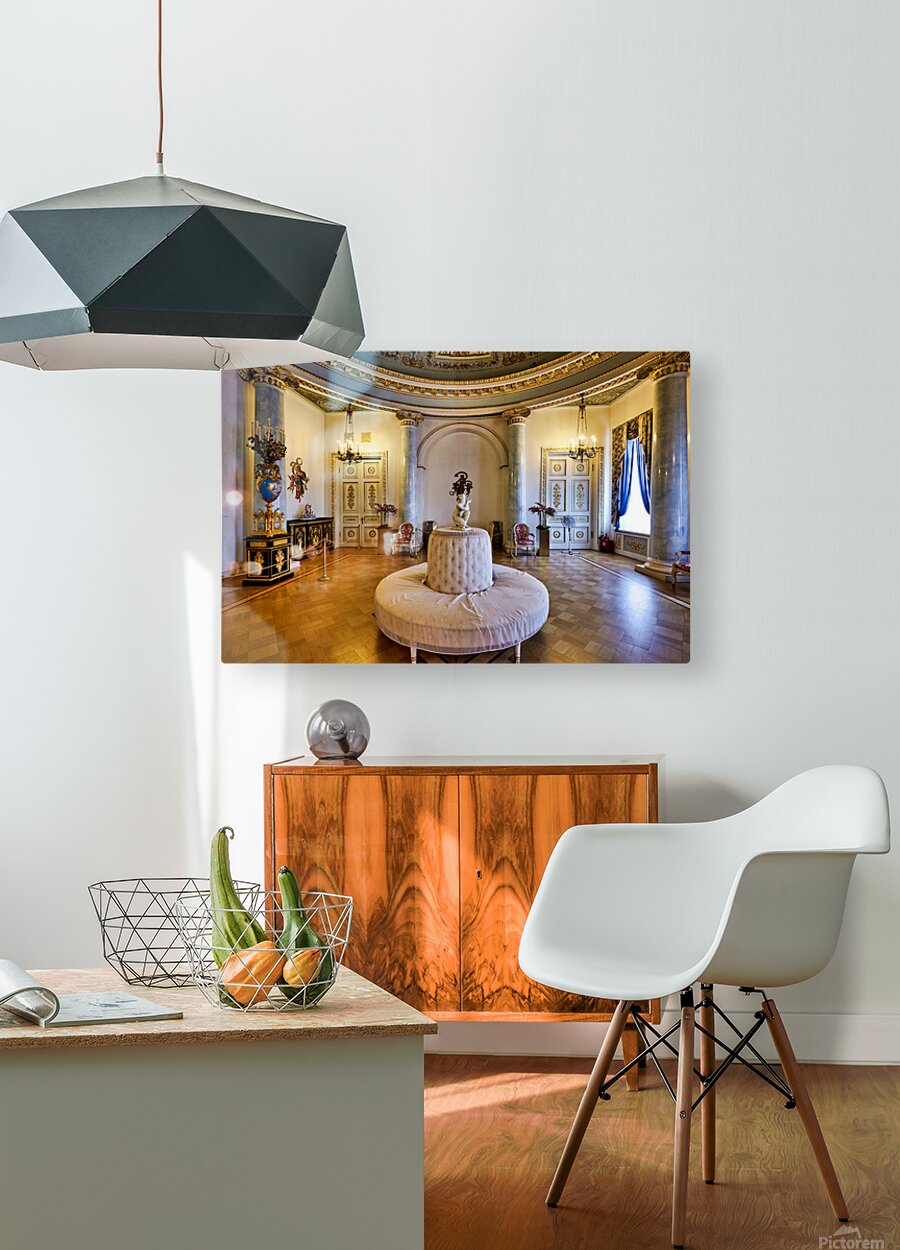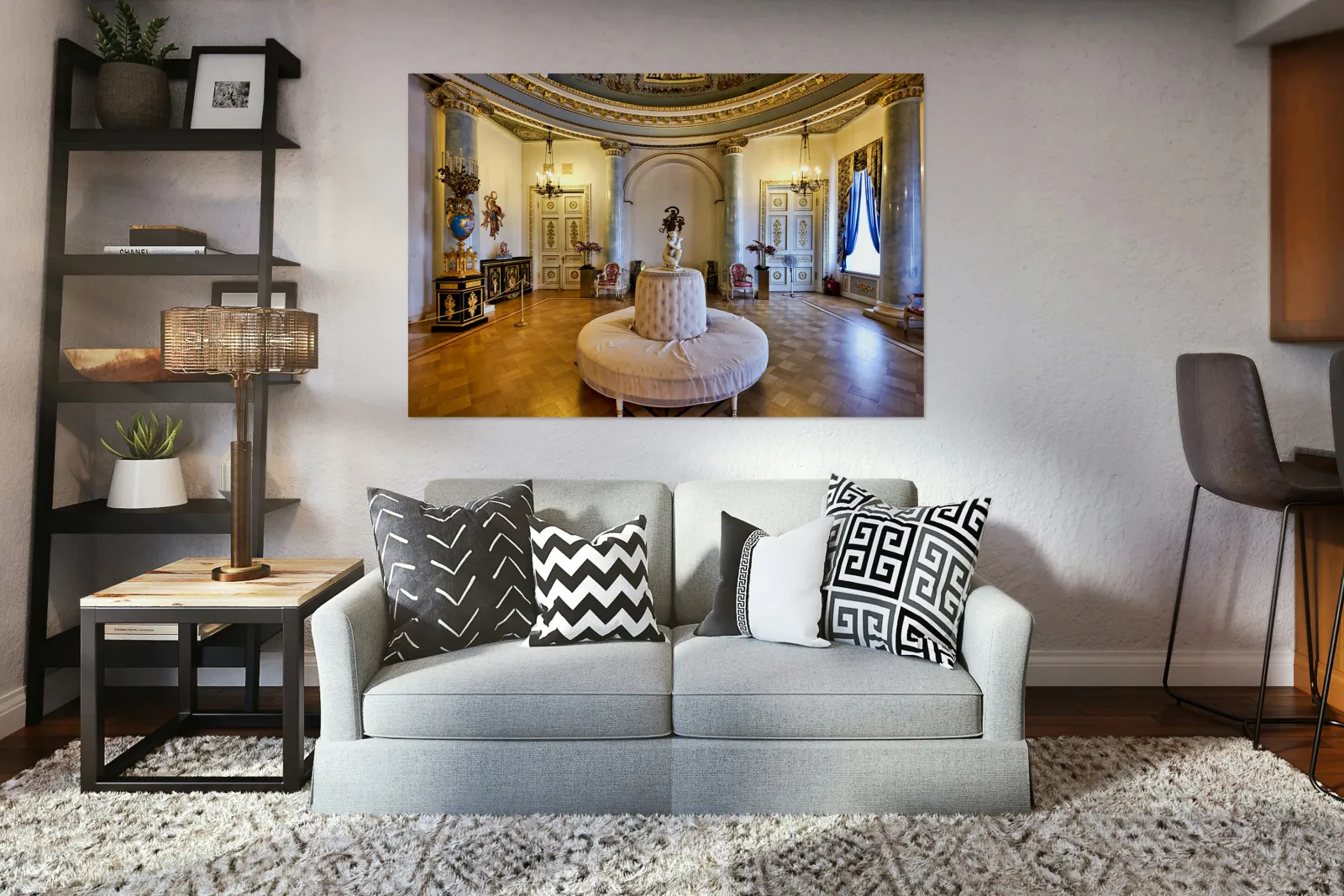 Visitors view the interior of Yusupov Palace in St. Petersburg. The room features a statue and elegant decor.