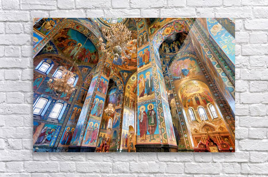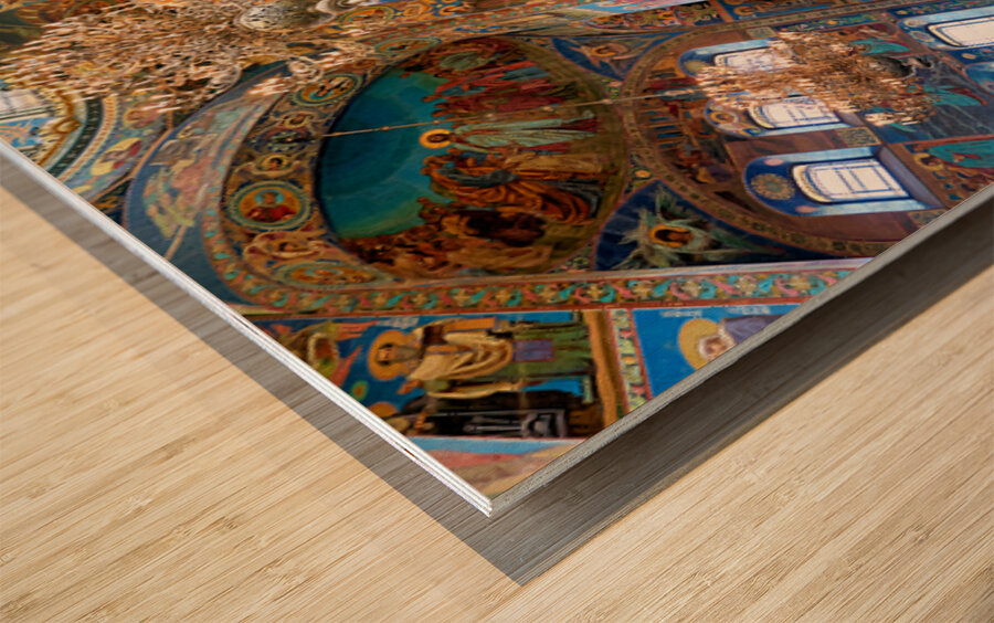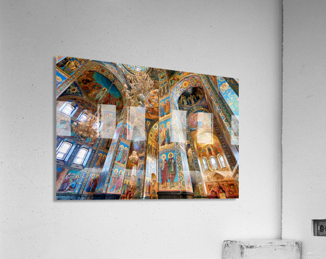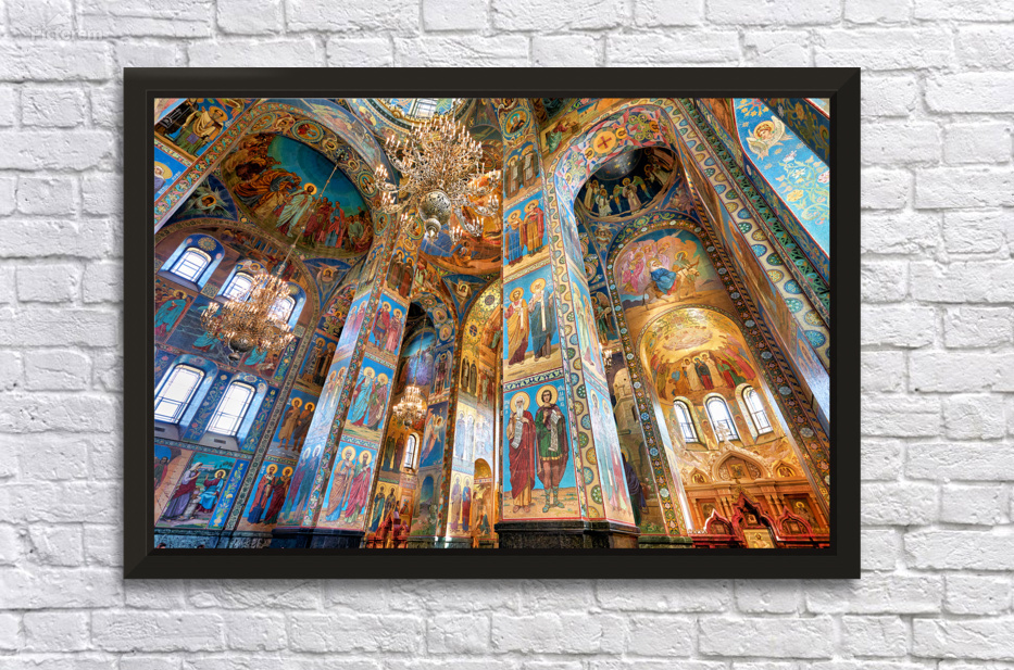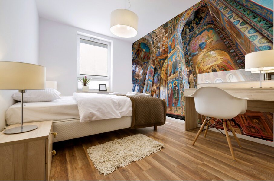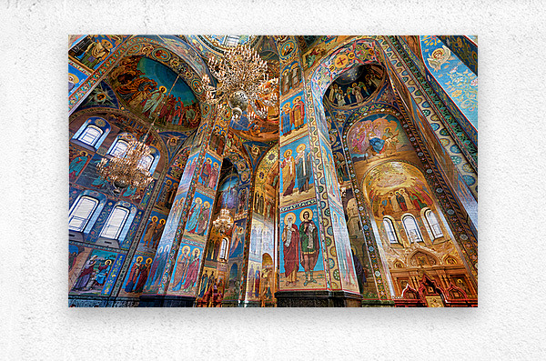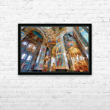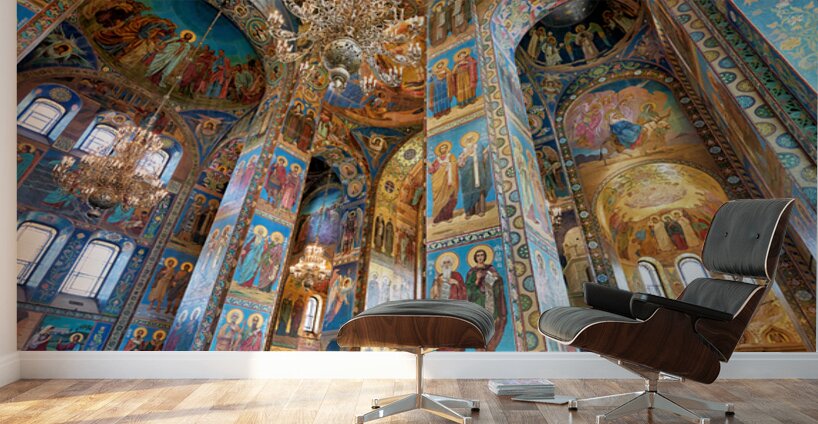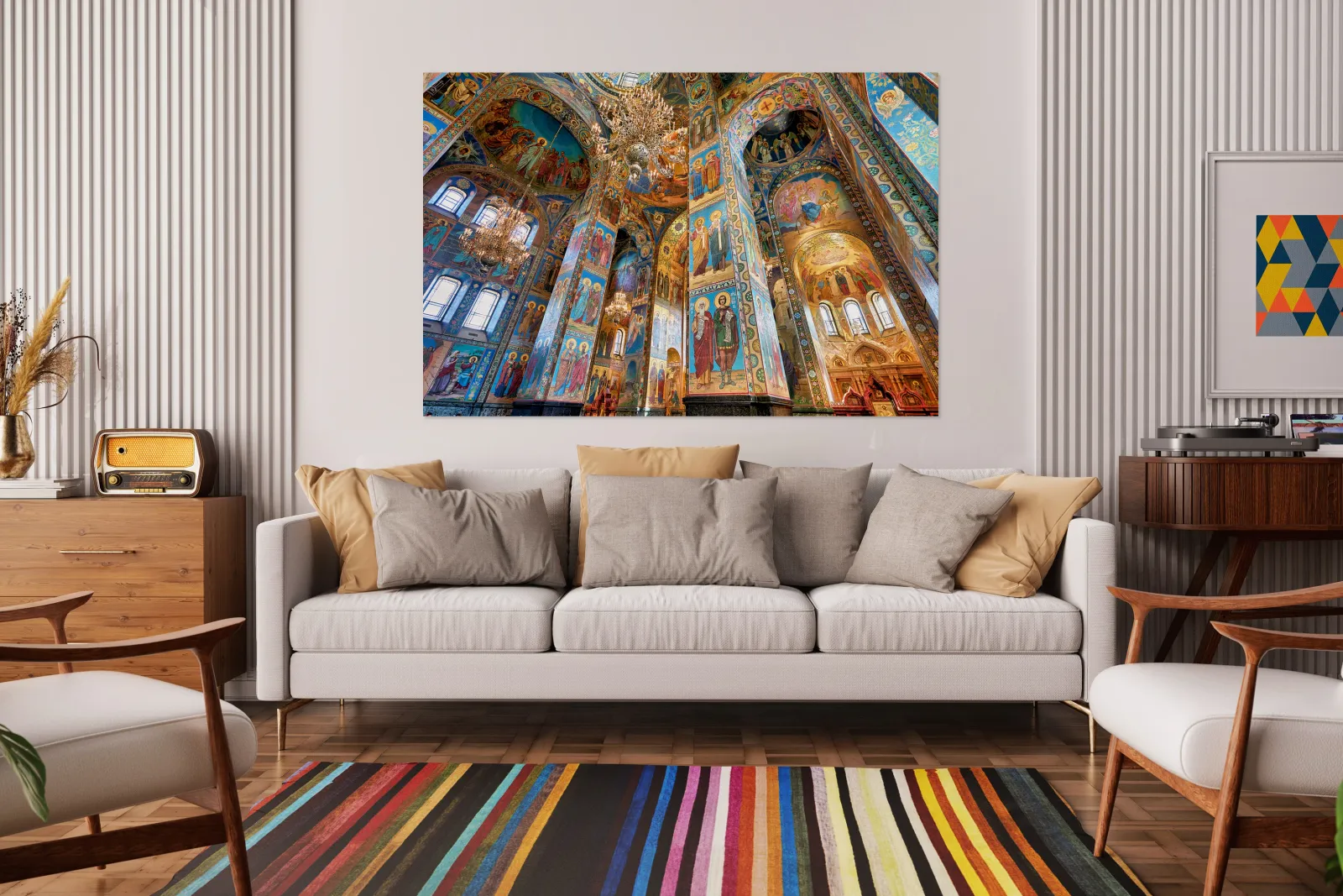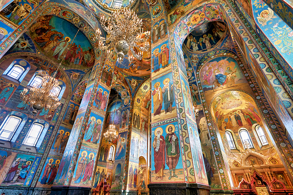 The interior of the Church of the Savior on the Spilled Blood in St. Petersburg filled with art and colorful designs.