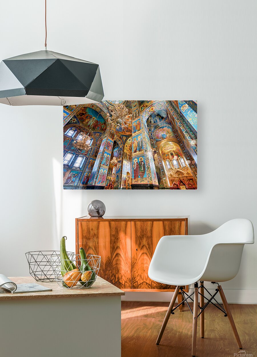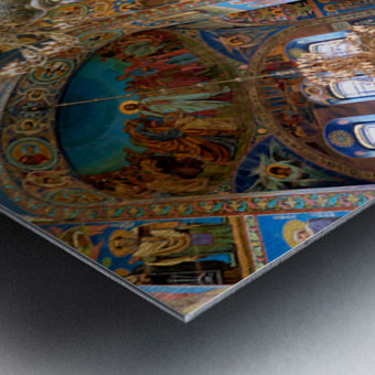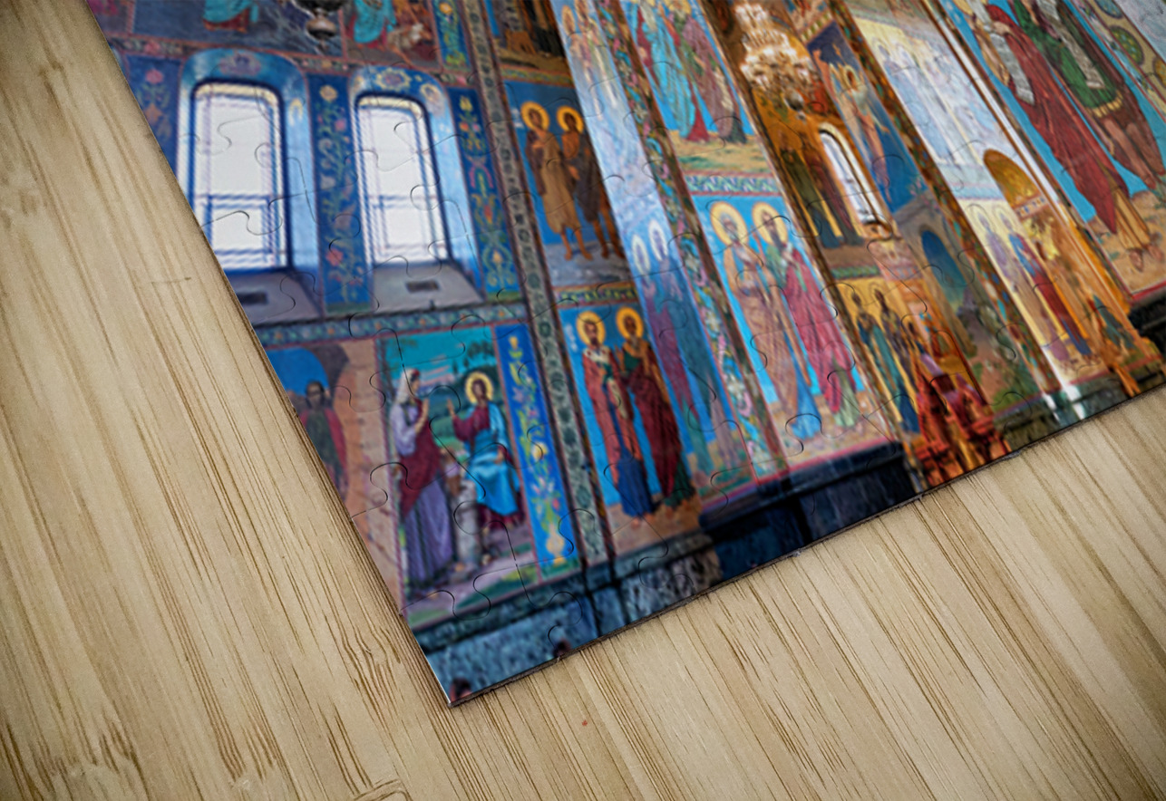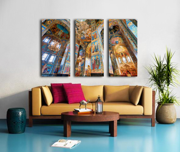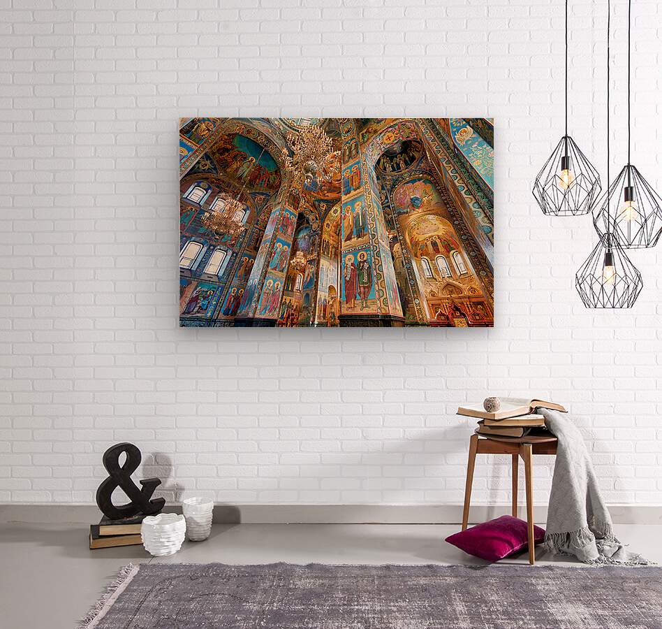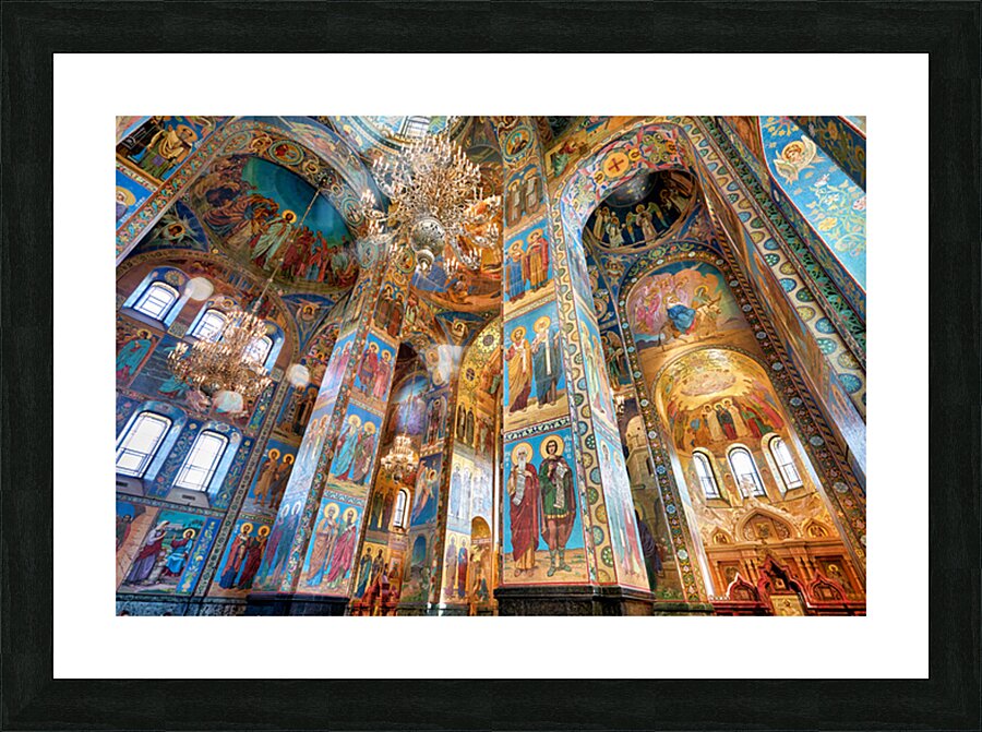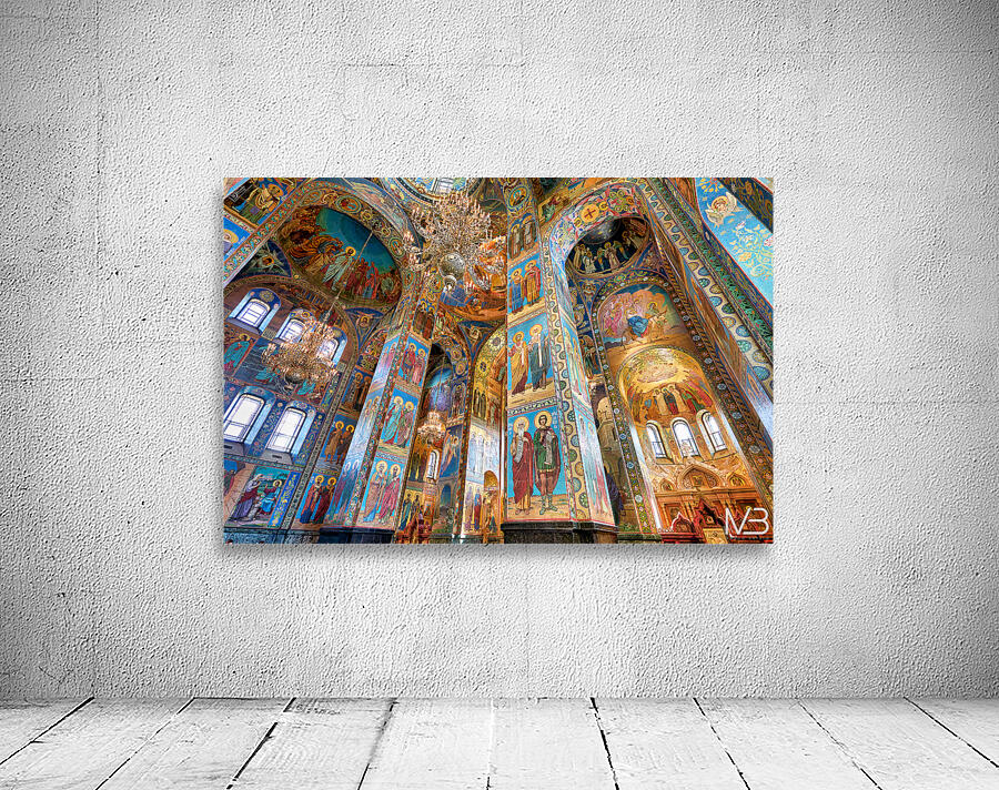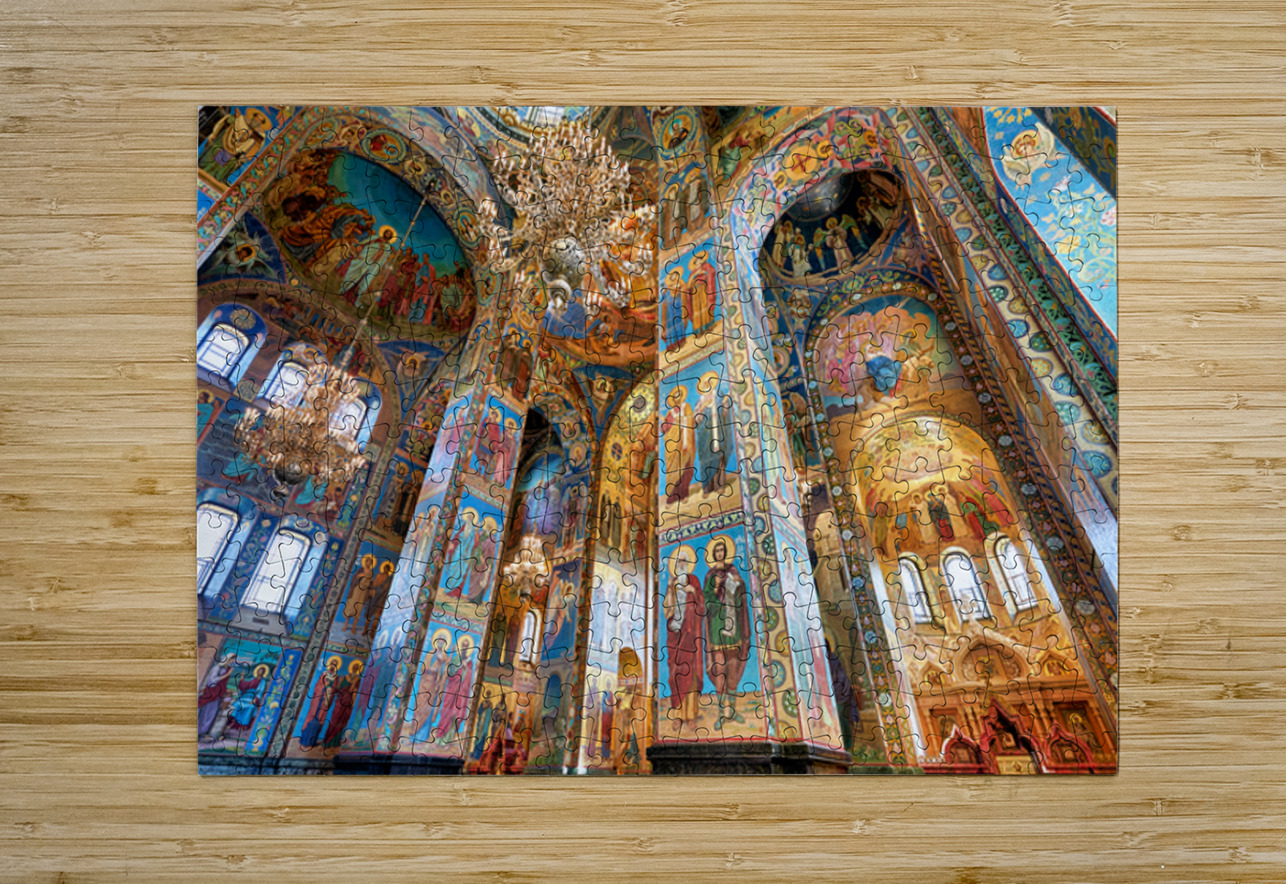 The interior of the Church of the Savior on the Spilled Blood in St. Petersburg filled with art and colorful designs.