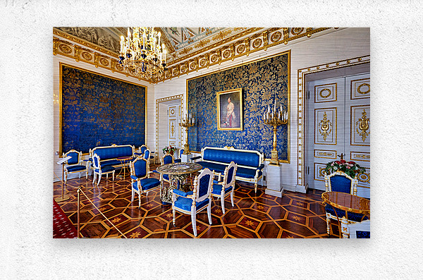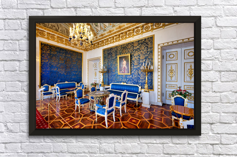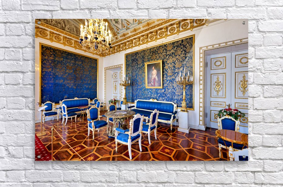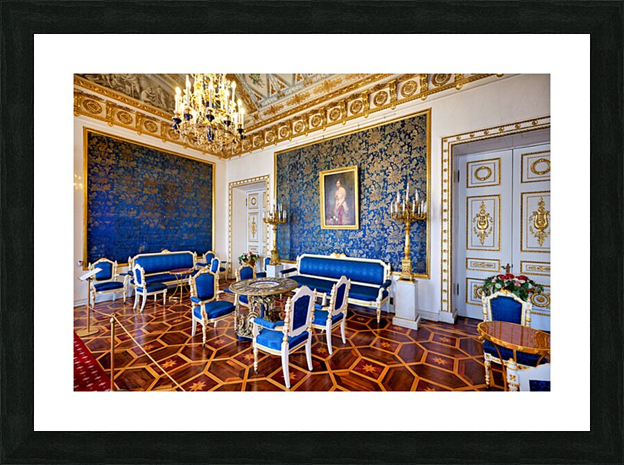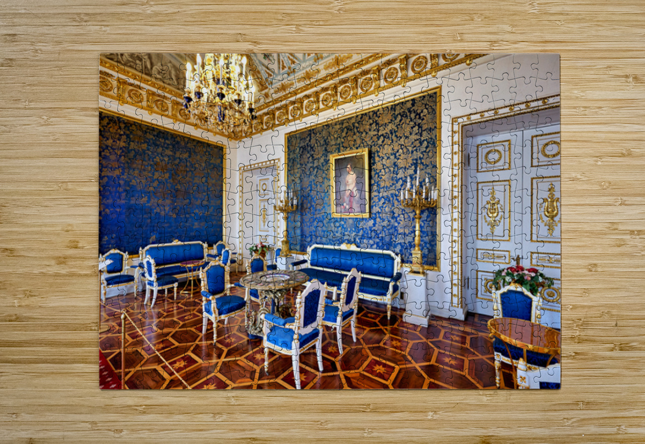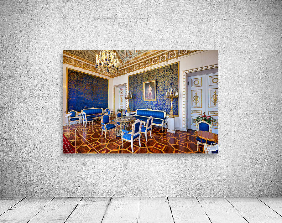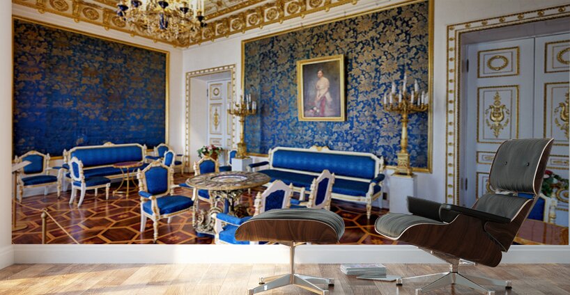 Inside the Yusupov Palace in St. Petersburg blue walls and furniture are arranged neatly. The room has a chandelier and wooden floors.